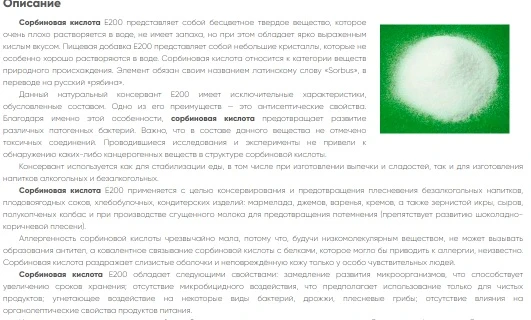 Сорбиновая кислота так же используется для обработки упаковочных материалов для пищевых продуктов.