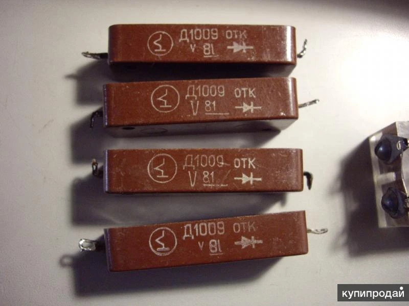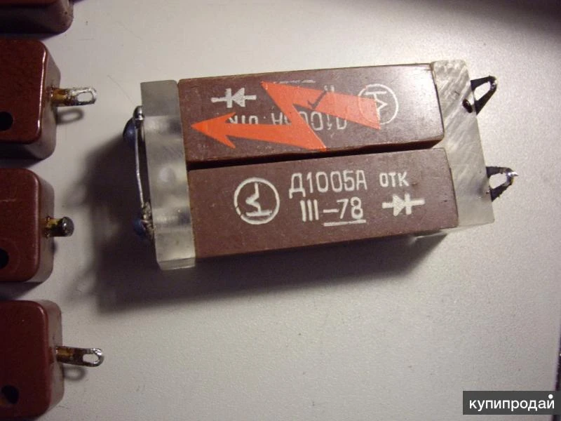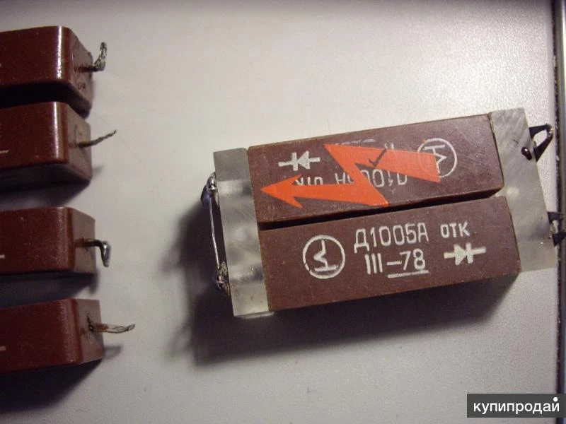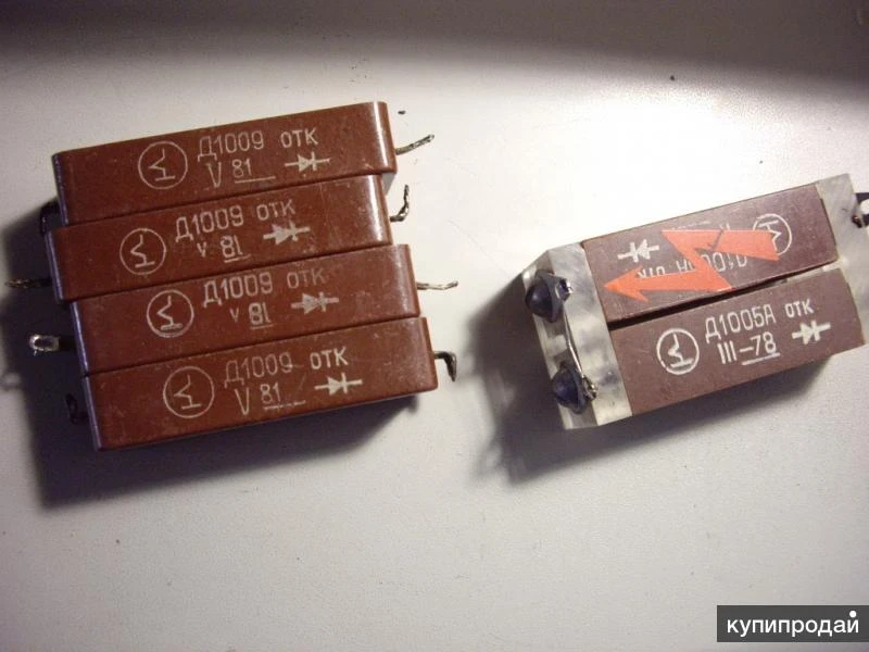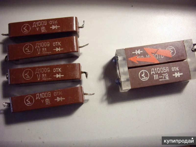 Д1005А и Д1009 Столбы диодные высоковольтные. Д 1005А - 2 штуки. Цена 250 руб шт Д 1009 - 4штуки Цена 250 руб шт Вышлю в регионы после оплаты Д1005А Содержит драп металлы: Золото : 0,0084875 Серебро : 0,0028188 Столбы из кремниевых, сплавных диодов, выпрямительные. Предназначены для преобразования переменного напряжения частотой до 1 кГц. Выпускаются в пластмассовых корпусах с жесткими выводами. Тип столба и схема соединения электродов с выводами приводятся на корпусе. Масса столбов: - Д1004, Д1005А не более 35 г, - Д1005Б, Д1006, Д1007, Д1008 не более 60 г. Технические условия: аА0.336.522 ТУ. Основные технические характеристики диода Д1005А: • Uoбp max - Максимальное постоянное обратное напряжение: 4 кВ; • Inp max - Максимальный прямой ток: 50 мА; • fд - Рабочая частота диода: 1 кГц; • Unp - Постоянное прямое напряжение: не более 5 В при Inp 50 мА; • Ioбp - Постоянный обратный ток: не более 100 мкА при Uoбp 4 кВ Д1009 Содержит драп металлы: Золото : 0,0008391 Серебро : 0,0007084 Платина : 0,0000005 Столбы из кремниевых, диффузионных диодов, выпрямительные. Предназначены для преобразования переменного напряжения частотой до 1 кГц. Выпускаются в пластмассовом корпусе с заливкой эпоксидным компаундом с жесткими выводами. Тип столба и схема соединения электродов с выводами приводятся на корпусе. Масса столба не более 53 г. Технические условия: ТР3.362.016 ТУ1. Основные технические характеристики диода Д1009: • Uoбp max - Максимальное постоянное обратное напряжение: 2 кВ; • Inp max - Максимальный прямой ток: 300 мА; • fд - Рабочая частота диода: 1 кГц; • Unp - Постоянное прямое напряжение: не более 2,6 В при Inp 300 мА; • Ioбp - Постоянный обратный ток: не более 100 мкА при Uoбp 2 кВ