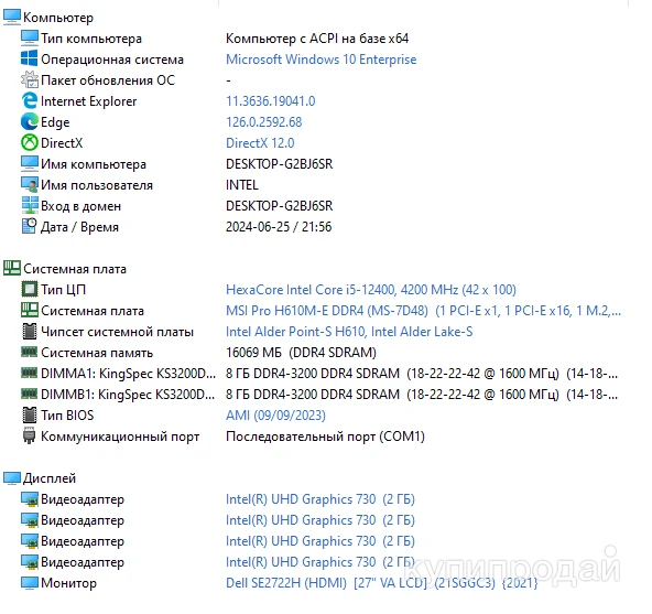 Мощнейший топовый игровой компьютер (системный блок) Intel Core I5-12400- 4.4ггц в максимальном Turbo Boost (полноценный, со встроенным мощным видеоядром Intel Arc (Uhd)/ не путать с более дешёвой урезанной версией F, большой мощный RGB башенный кулер с 4-х медными трубками, Озу-16gb/ Ddr4-3200, фирменный скоростной накопитель M2.NVME Hynix со стильным радиатором -512Gb, фирменная материнская плата MSI PRO с поддержкой процессоров 13-го и 14-го поколений с мощной звуковой картой, Usb-3.2, усиленный металлический слот Pci-e_x16_4.0 / 5.0 под внешнюю мощную видеокарту, стильный компактный но вместительный корпус. Компьютер (системный блок) комплектовался и настраивался профессионально совсем недавно лично мной (опыт-более 30 лет, с 1988 года, с компьютеров "бейсик-корвет").. Уже полностью настроен и готов к работе. Уже установлена свежая версия ОС Windows-10, со всеми драйверами, необходимым пакетом программ, антивирус и оптимизация системы. Работает очень шустро, система грузится за считанные секунды. Отличный аппарат для работы, учёбы, интернета, фотошопа, стримов, рендеринга, монтажа видео и многих игр. Данный процессор уже имеет все самые новые современные инструкции. Данный процессор на столько крут, что в играх равен или даже мощнее AM5 Ryzen_7600 (тесты в играх покажу по запросу, или продемонстрирую при продаже данного Пк).то есть, данный ПК-с большим запасом на будущее . Цена окончательная, Обмена и торга нет (совсем нет). Продаётся как личное имущество и не связано с предпринимательской деятельностью. Все хитро сделанные перекупы с предложениями "заберу за..." - идут на... Не подтверждённые пользователи, скрывающие свой город и просящие отправить за свой счёт - сразу в ЧС. ЦЕНА: 41 500 руб. -Можно добавить в комплект новый мощный блок питания на 600W и мощную ещё практически новую на пломбах и с родной коробкой видеокарту Sapphire OC Overclock RX570-4Gb/ 256bit/ GDDR5/ FSR/ Rezisable Bar/ Vulkan + доплата 13500 р. Продаётся как личное имущество и не связано с предпринимательской деятельностью.