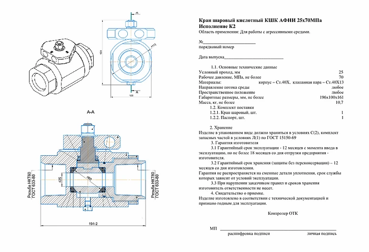 Кран шаровый АФНИ.306121.011 К АФНИ 25х70 МПа Кислотостойкий К1