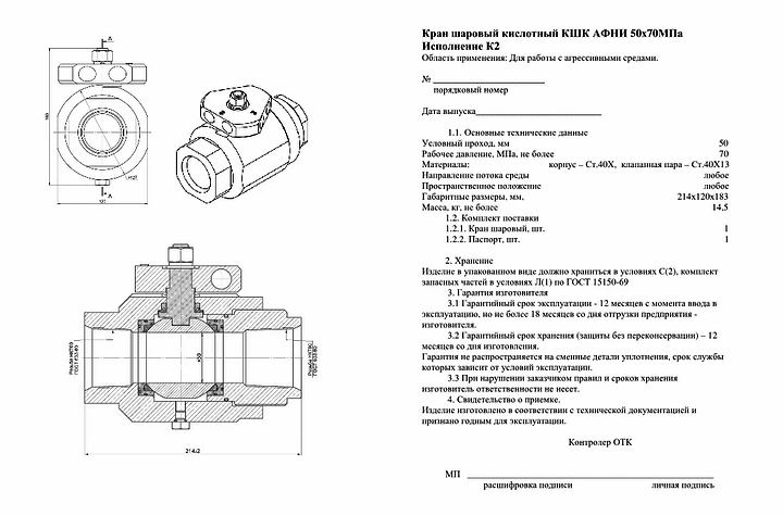 Кран шаровый АФНИ.306121.005 АФНИ 50х70 МПа Кислотостойкий К1
