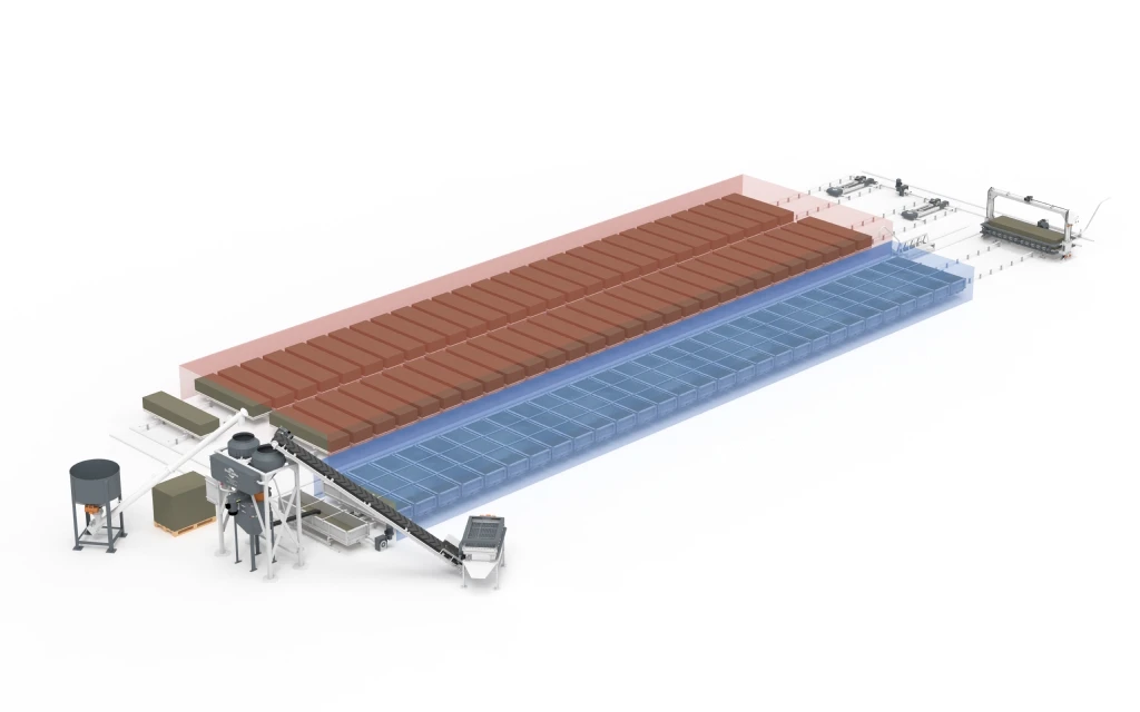 Линия состоит из неподвижно стоящего смесителя ёмкостью 450 литров, блока дозаторов с электронным весовым терминалом, ленточного и шнекового транспортера для сырья, передвижных форм, рельсовых путей, толкателей и механической резки.