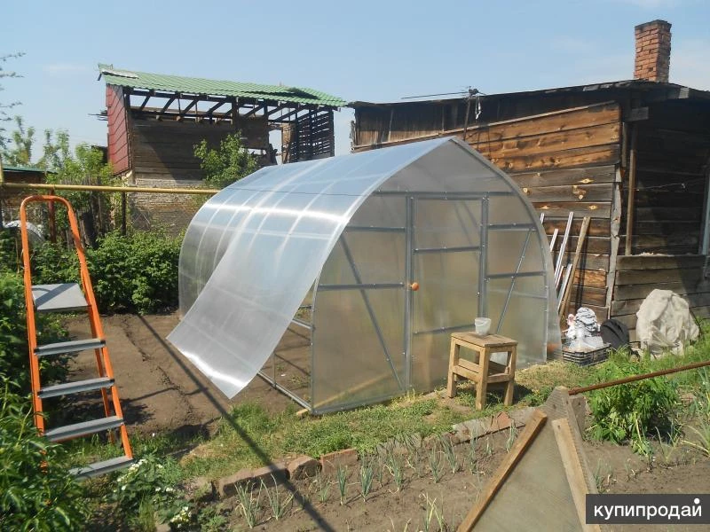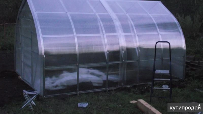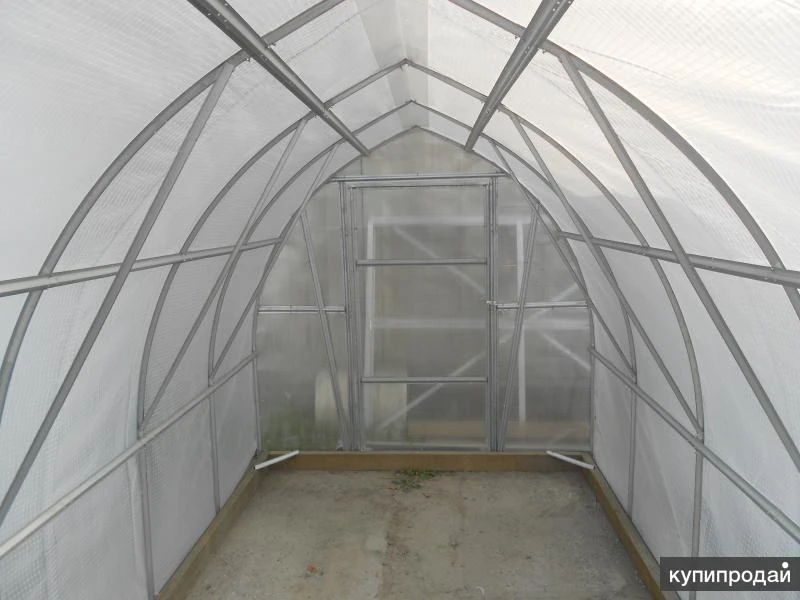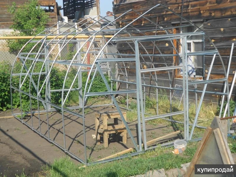 Цена каркаса без покрытия= 2,5 х 3,95 м = 10000руб. Отравим в 300городов России и Казахстана = туда где есть терминалы ТК "Деловые линии"; "Энергия". Есть каркасы шириной 1,95 метра. Цена такая же. Хорошо всем известно, что на двухскатной крыше снега скапливается всегда меньше, чем на арочной. А с наших теплиц, имеющих оригинальную "ноу-хау"- изюминку в конструкции, он вообще преимущественно сваливается сам, а порывы ветра помогают ему в этом. Летом же капли холодного конденсата скатываются по стенке и не провоцируют болезни урожая. Ширина этих каркасов = 2,5 м., высота в коньке =2,05 м. поэтому у них все в порядке как с прочностью собранного каркаса, так и с его универсальностью. Все детали каркаса изготовлены из оцинкованного тепличного "W"-профиля. Дуги-стропила расположены через 70/50 см ! Конек сделаете сами - из полосы сотового поликарбоната, вырезанной из остатка после обшивки фасада. Количество стрингеров ( связи между дугами) = 8 шт. Две двери без форточек комплектуются фирменными двусторонними ручками, позволяющими закрываться внутри теплицы в прохладное время года .Возможна комплектация форточками-купе по 500 руб/шт, минимум = 2 шт. Фасады усилены четырьмя раскосами. Устанавливать рекомендуем на деревянный антисептированный короб, обязательно прикрепленный к земле. В транспортной упаковке каркасы теплиц можно перевозить на легковом автомобиле. Вес каркаса 4 м = 35 кг. Рекомендуем покрытие теплиц этого класса делать гибридным: фасад = поликарбонат , тоннель = армированная пленка. Это и удобно и практично. Покупателям подскажем, как это правильно сделать и укомплектуем пленкой.