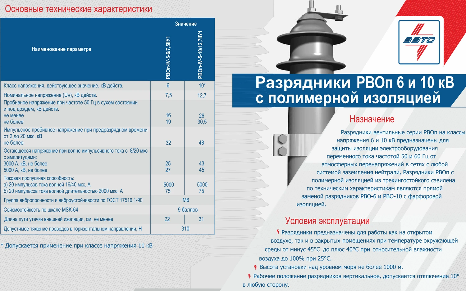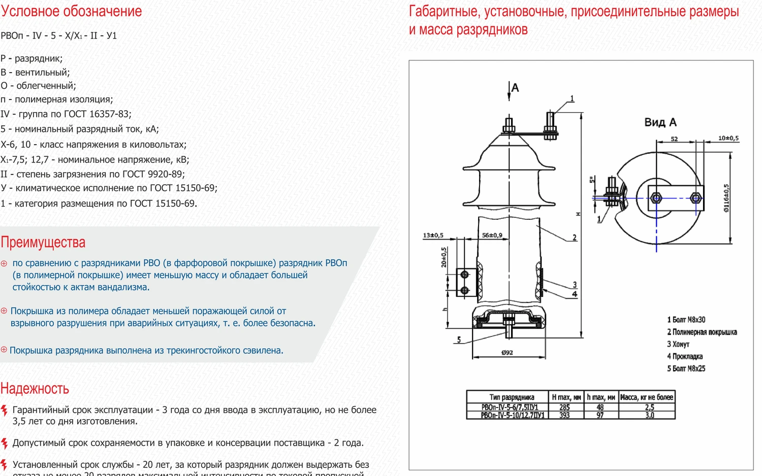 По сравнению с разрядниками РВО (в фарфоровой покрышке) разрядник РВОп (в полимерной покрышке) имеет меньшую массу и обладает большей стойкостью к актам вандализма;