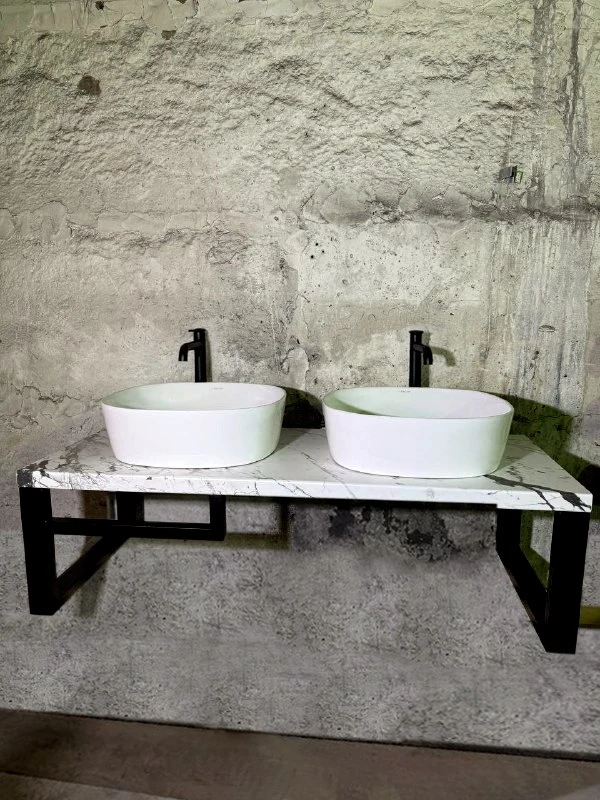 Фото 4: Подвесная столешница с 2-я раковинами, с держателем для полотенец, материал столешницы - водоотталкивающее ДСП, SLOTEX, брекчия капрая, размер 120*50, цена 34 500₽ (цена обьявления).