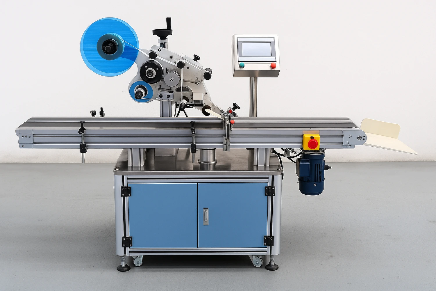 "Этикетировочный автомат ЭМ04.02 предназначен для нанесения самоклеящихся этикеток на плоскую и сложную тару. Для качественного приглаживания этикетки предусмотрен мягкий приводной узел.