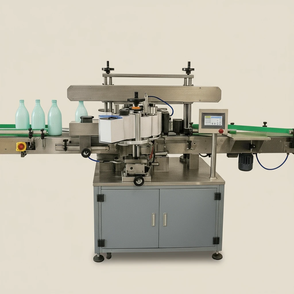 "Этикетировочная машина ЭМ08.00C предназначена для одновременного нанесения самоклеящихся этикеток спереди и сзади бутылок разной формы.