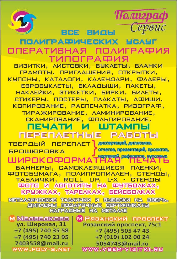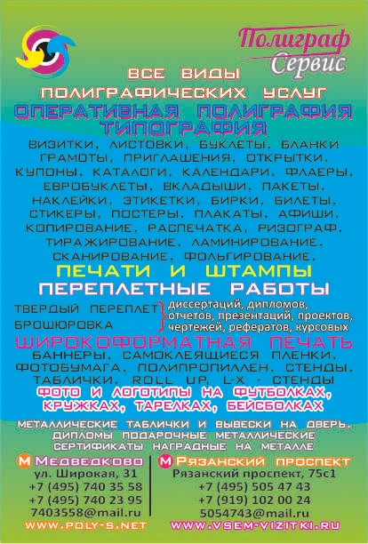 Типография. Оперативная полиграфия 8(495)7403558 СВАО метро Бабушкинская, Медведково 8(495)5054743 ЮВАО метро Рязанский пр-т Штендеры. Таблички. Стенды. Выставочные Уличные стенды. Металлические сертификаты подарочные. Металлические таблички на дверь. Металлические вывески. Таблички на металле. Металлические наградные дипломы. Поздравительные дипломы на металле. Фотопечать. Фотокниги. Переплет твердый книжный и брошюровка дипломов, диссертаций, проектов, чертежей, отчётов. Фото на футболках, кружках, тарелках. Копировальный центр : Визитки, Открытки, Листовки, Бланки, Флаера, Приглашения, Наклейки, Буклеты, Купоны, Ценники, Билеты, Бирки, Стикеры, Объявления, Меню, Бейджи. Самокопирка. Грамоты. Каталоги. Авторефераты, Фото на футболках, кружках, тарелках. Широкоформатная интерьерная печать. Печати штампы - Полиграфические услуги - Широкоформатная печать. Печать на холсте, бэклите, баннере, самоклейке. Плоттер - Ризограф. Тиражирование. Копирование. - Фотопечать - Тампопечать - Переплет, брошюровка документов - Нанесение изображения на футболки, одежду, спортивную форму, спецодежду, кружки, металл … Сублимация, термоперенос, термотрансфер. - Рекламные конструкции. Стенды. Вывески. Указатели. Баннеры. Наклейки. Таблички. Щтендеры. - Лазерная резка, фрезеровка. - 3 D печать - Печати и штампы - Закатные значки