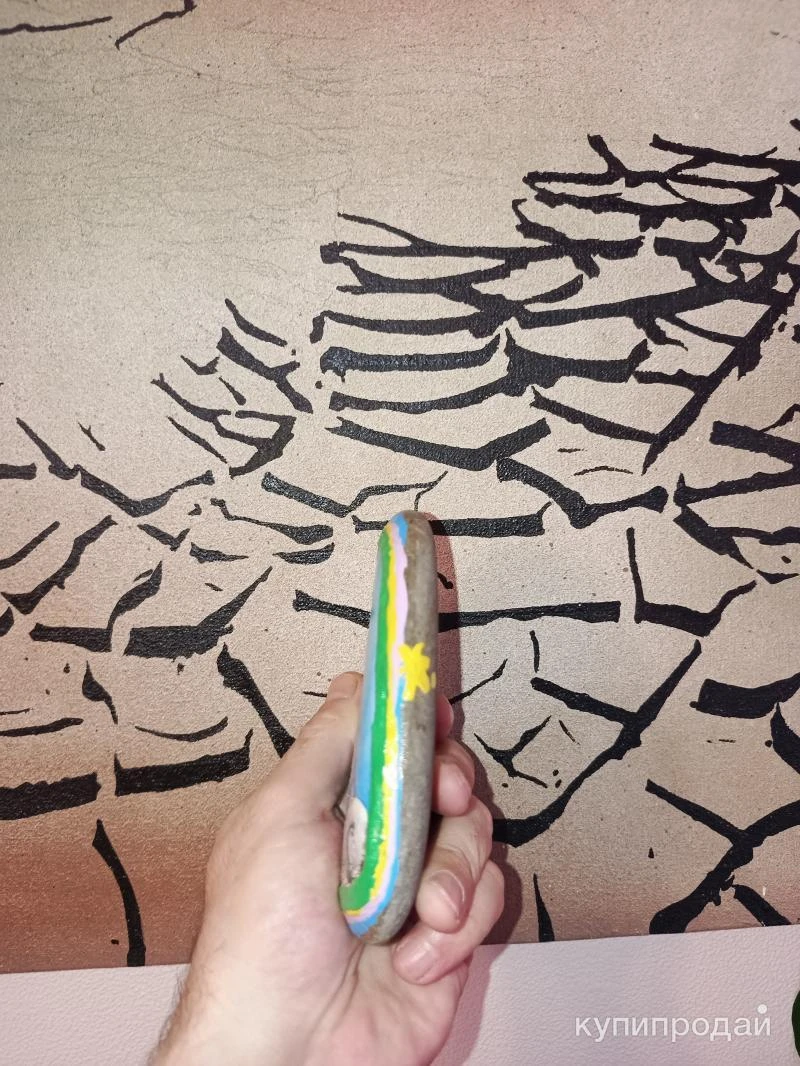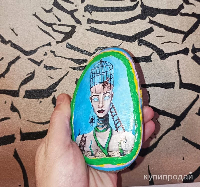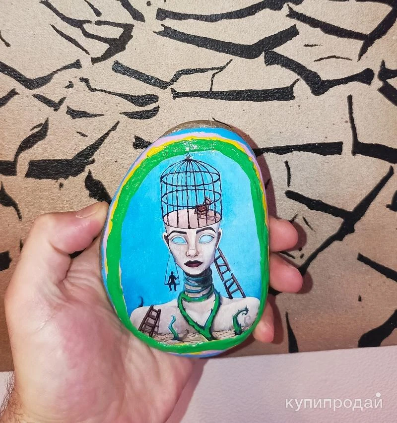 Камень с философским рисунком Уникальное произведение искусства ручной работы. Этот камень, подаренный природой, превратился в миниатюрную галерею, хранящую в себе глубокий философский смысл. Техника исполнения. Изображение нанесено на камень с помощью комбинированной техники фотопечати и акриловой живописи. Каждый мазок кисти и каждая деталь рисунка созданы вручную, что придает изделию неповторимый шарм и индивидуальность. Материалы. Основой сувенира служит натуральный камень, обладающий природной красотой и энергетикой. Использование акриловых красок гарантирует высокую стойкость изображения к внешним воздействиям. Дизайн. Центральным элементом композиции является изображение головы человека с клеткой вместо мозга, внутри которой находится птица. Этот образ символизирует ограниченность мышления, внутренние конфликты и стремление к свободе. Окружающие элементы - лесенки, петля - усиливают драматизм композиции и заставляют задуматься о смысле жизни. Преобладание синего цвета создает ощущение глубины и безграничности, контрастируя с яркими акцентами других цветов. Особенности: * Эксклюзивность. Каждый камень уникален по форме и текстуре, что делает каждое изделие неповторимым произведением искусства. * Философская глубина. Изображение на камне заставляет задуматься о вечных вопросах бытия, о свободе и выборе. * Декоративность. Сувенир станет оригинальным украшением интерьера и предметом интеллектуальных бесед. Artstones. Это не просто сувенир, это произведение искусства, которое приглашает к размышлениям и самопознанию. Каждый камень – это маленькая вселенная, полная смыслов и тайн.