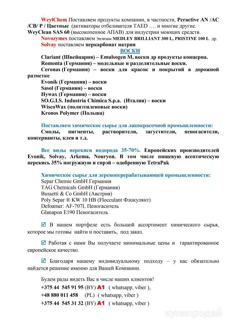 День добрый! Наша Kомпания занимается дистрибуцией из Европы химического сырья для различных производственных сфер. Мы работаем с такими компаниями как Ashland, Wacker (Германия), Basf (Германия), Clariant (Швейцария), Romonta (Германия), Dow (США), Momentive (США), Melamin (Словения), ExxonMobil Chemical, Evonik, Ineos, Covestro, Enaspol, Spolchemie, Solvay S.A., Henkel (Германия), Huntsman, Momentive (США), Arkema, Nouryon, Ercros (Испания), Alder (Италия), Promindsa (Испания), Heubach (Германия), Orlen (Польша) Химическое сырье для агропромышленного комплекса: ПАВы, этиленамины, микронутриенты, кислоты, соли, растворители, антислеживающие компонеты и др. От производителей: Clariant, Bozzetto, Croda, Nouryon, Schill+Seilacher’s, Stepan. CRODA АГРОХИМИЧЕСКИЕ ЭМУЛЬСИИ: Atlas™ G-5002L, Atlox™ 4913 и др. CLARIANT Emulsogen EL360 , Genagen 4296 , Genagen, Emulsogen TS160 ARKEMA Агенты противослеживающий агент, антикомкователь для удобрений: Galoryl AT Powder , Galoryl AT Fert L Химическое сырье для пищевой промышленности: Arla Foods (Дания) – продукты для молочной промышленности, протеины, молочные белки. Nutrilac® YO-7700 (Дания) Lacprodan 80 (Дания) Novozymes (Энзимы для различных производственных сфер) Химическое сырье для производства бытовой химии и дезинфицирующих средств: Arxada (Lonza), Bozzetto, Microsyn. Поставляем продукты: Vantocil IB, Vantocil TG, Bardac 2280, Bardac 22, Barquat DM 50, Barquat BAC – 50, Lonzabac BG, Bardap™ 26, Bardac 2080, Microsyn PHMB 20 WeylChem Поставляем продукты компании, в частности, Peractive AN /AC /CB/ P / Цветные (активаторы отбеливателя TAED …. и многие другие. WeyClean SAS 60 (высокопенное АПАВ) для индустрии моющих средств. Novozymes поставляем энзимы MEDLEY BRILLIANT 300 L, PRISTINE 100 L др. Solvay поставляем перкарбонат натрия ВОСКИ Clariant (Швейцария) – Emulsogen M, воски др продукты концерна. Romonta (Германия) – модельные и разделительные воски. Ceronas (Германия) – воски для красок и покрытий в дорожной разметке Evonik (Германия) – воски Sasol (Германия) – воски Hywax (Германия) – воски SO.G.I.S. Industria Chimica S.p.a. (Италия) – воски WiscoWax (полиэтиленовые воски) Kronos Polymer (Польша) Поставляем химическое сырье для лакокрасочной промышленности: Смолы, пигменты, растворители, загустители, пеногасители, консерванты, клея и т.д. Все виды перекиси водорода 35-70%. Европейских производителей Evonik, Solvay, Arkema, Nouryon. В том числе пищевую асептическую перекись 35% погружную и спрэй – одобренную TetraPak Химическое сырье для деревоперерабатывающей промышленности. В нашем портфеле есть большой ассортимент химического сырья, которое мы готовы найти и поставить, под заказ. В нашем портфеле есть большой ассортимент химического сырья, которое мы готовы найти и поставить, под заказ. Будем рады видеть Вас в числе наших клиентов!+48 880 011 458 (PL) ( whatsapp, viber ) +375 44 545 31 32 (BY) А1 ( whatsapp, viber )
