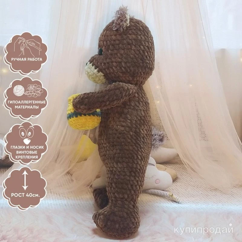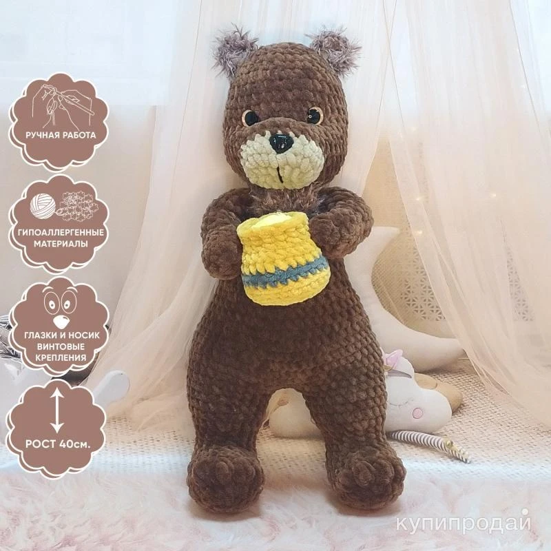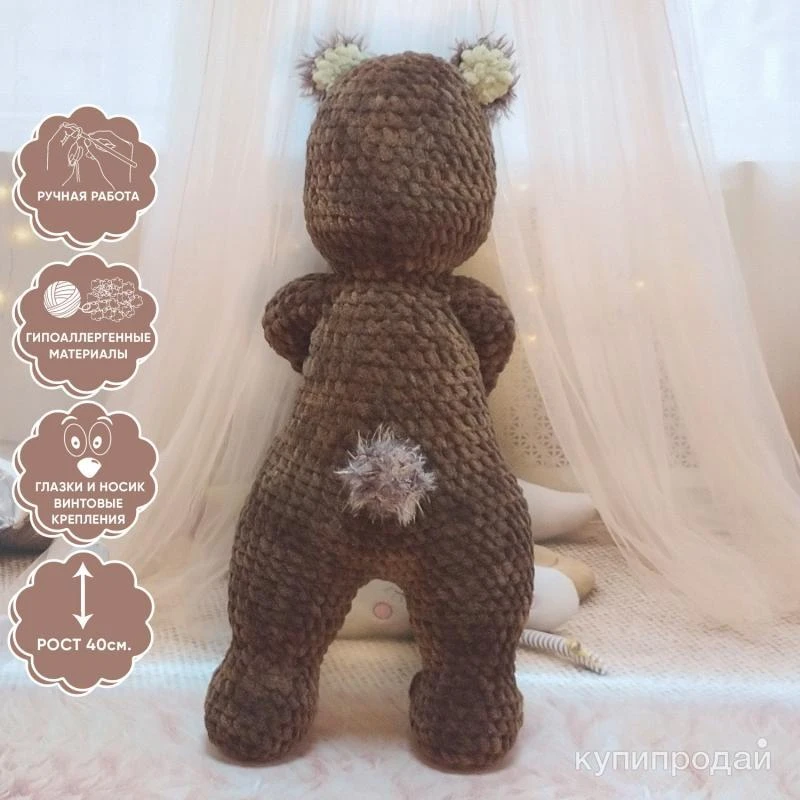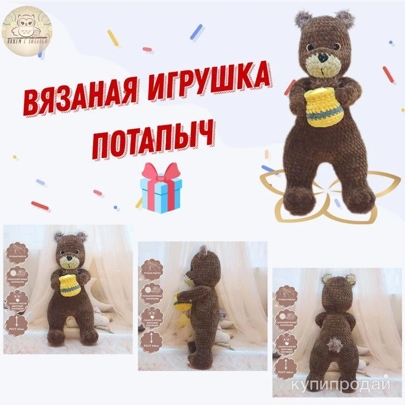 ? Мягкая игрушка Медвежонок Потапыч ? ? Ручная работа. Связана из гипоаллергенной и безопасной для детей плюшевой пряжи, наполнитель холлофайбер, глазки и носик на надежных винтовых креплениях. Стандарт OEKO-TEKS. Рост 40см. ? Игрушки связанные вручную несут в себе особую положительную ауру. В каждую игрушку вкладывается частичка души Мастера. ? Игрушка связана с любовью! ? ? Всегда является актуальным подарком не только для детей, но и для взрослых. ? Мягкая игрушка Медвежонок Потапыч прекрасно выглядит в качестве предмета интерьера. ? Вязаная игрушка замечательный подарок для ребенка, Маме, любимой девушке. Друзьям: на 8 марта, 23 февраля, Новый год, День Рождения и просто без повода ? Дарите Родным и Близким радость! Вяжу для Вас игрушки, пледы и подушки с любовью! ? ? Самовывоз: Москва ул.Правды 8 корп.13 ?♂ Доставляем курьером по г.Москва в пределах МКАД ? Доставка "Почта России", "СДЭК" ❗️ Еще больше игрушек, подушек и пледов в моём интернет магазине. Ссылка (Перейти на сайт) под отзывами (смотрите справа).