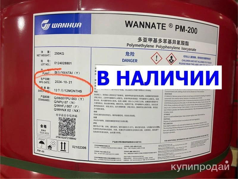 Изоцианат Wannate PM – 200 (Wanhua), Karunate Каrооn КР-200, Karunate Каrооn КР-200 SABIC MDI 2031 Отгрузка – бочки 250 кг. Скидки на объем. Оплата по курсу ЦБ + НДС. Свежий! Изоцианат используется для производства напыляемой теплоизоляции, производства монтажных пен, герметиков, теплоизоляционных плит ПИР, наливных полов, комплектующих для бытовой техники и автомобилей: Жесткие пенопласты – используются для производства сэндвич-панелей и полиуретановой древесины, Промышленные клеи, полимерные пены. Гибкие пенопласты – используются для изготовления мебели, автомобильных сидений, гибкой упаковки и ковровых покрытий; это крупнейшее рыночное приложение для полимерного МDI. Полиуретановые пластмассы, вспениваемые на месте – от мягких и губчатых до твердых и пористых для использования в мебели, упаковке, изоляции и судостроении. Полиуретановые покрытия – используются на коже, проволоке, облицовке резервуаров и кирпичной кладке. Жесткие пеноматериалы для заливки на месте – для использования в бытовых приборах и, в меньших количествах, для упаковки. Литые эластомеры – для производства таких изделий, как роликовые колеса. Отгрузка – бочки 250 кг. Аналоги изоцианата: Полимерный МДИ Полиизоцианат MDI Wannate PM-200 Ваннат РМ-200 Ningbo Wanhua Polyurethanes Китай, Karunate Каrооn КР-200 Карунат КП-200 Иран, Voranate M229 Воранат М299 Dow Europe SA Нидерланды, Millionate MR-200 Миллионат МР-200 Mitsui Chemicals Япония,Cosmonate M200 Космонат М200, Kumho Mitsui Chemicals Корея, Ongronat 2100 Онгронат 2100, Lupranate M20S Лупранат М-20С Basf Германия, Desmodur 44V20L Десмодур 44В20Л Bayer Германия, Suprasec 5005, Супрасек 5005 Elastogran Германия.
