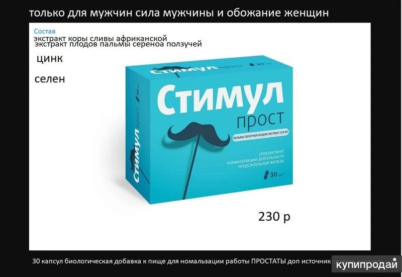СТИМУЛПРОСТ изготовитель Квадрат С Биологически активная добавка к пище на основе растительных компонентов, которые способствуют улучшению функционального состояния мочеполовой системы у мужчин. Любой мужчина хочет быть активным, здоровым, всегда оставаться в хорошей физической форме, пользоваться успехом у женщин и ни в чем себе не отказывать. Для улучшения и поддержания функции предстательной железы, профилактика заболеваний предстательной железы, улучшение функционального состояния репродуктивной системы. Способствует уменьшению отечности, помогает устранить чувство неполного опорожнения мочевого пузыря, способствует уменьшению болезненных ощущений и чувства напряжения при мочеиспускании, в целом положительно влияет на процесс мочеиспускания. Улучшает функциональное состояние предстательной железы. Самовывоз от подъезда . почта России по предоплате за товар и доставку почтовые расходы на покупатели.