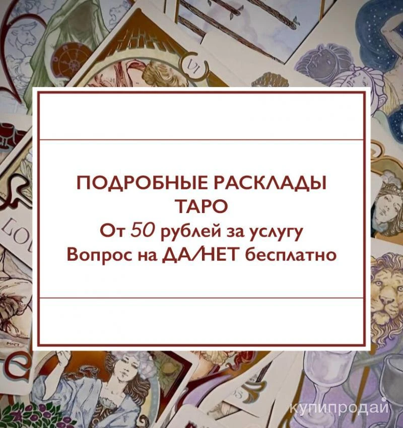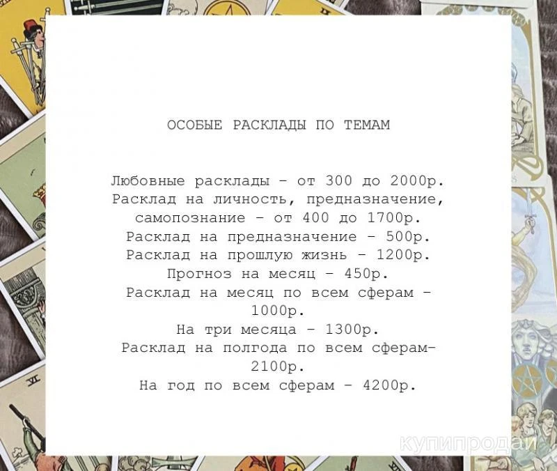 Здравствуйте, я таролог со стажем 3 года. Делаю расклады таро онлайн на самые разнообразные темы, стоимость зависит от обьема работы и ситуации. Для консультации нужна ваша дата рождения, имя и фото (та же информация о другом человеке). Также разбираю матрицу судьбы. Начальная цена ниже представленной. Беру 100% предоплату! Карта дня - 50р. 1 вопрос - 100р. 2 вопроса - 200р. 3 вопрос - 300р. Далее на каждый вопрос по 150р. +совет 50 р. Любовные расклады - от 300 до 2000р Расклад на личность, предназначение, самопознание - от 400 до 1700р. Расклад на предназначение - 500р. Расклад на прошлую жизнь - 1200р. Прогноз на месяц - 450р. Расклад на месяц по всем сферам - 1000р. На три месяца - 1300р. Расклад на полгода по всем сферам- 2100р. На год по сферам - 4200р. Полный разбор матрицы судьбы – 5000р. Telegram: @tem_perance Пишите сразу в телеграмм
