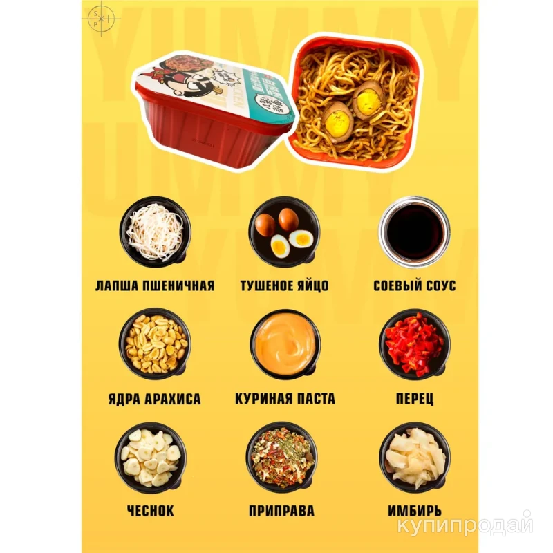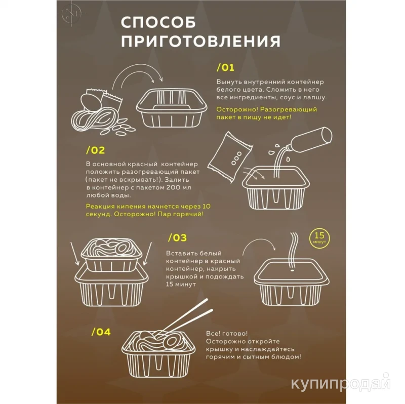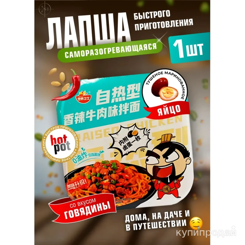 При заказе на Маркетплейсе OZON 1 порции по промокоду SALEKP5 - дополнительная скидка 5% ! Артикул товара OZON 1575447559 Артикул товара Wilberries 225915502 (Количество купонов ограничено) Переходите по ccылке и заказывайте со скидкой и бесплатной доставкой: goo.su/C1ukz Саморазогревающаяся лапша быстрого приготовления со вкусом говядины, 259,5 г. ( китайский самовар ) 1 штука - С Вакуумированным целым тушеным маринованным яйцом в сочетании с арахисом и перцем чили придает блюду восхитительную пикантность. Приготовьте себе неповторимую и заряженную энергией лапшу быстрого приготовления, которая превратит ваш обычный обед или ужин в настоящий кулинарный фурор! Наш набор содержит все необходимые ингредиенты, чтобы вы могли создать магическое блюдо, которое заставит ваши вкусовые рецепторы взорваться от восторга! Это вариант быстрого приготовления Хот Пот с саморазогревом, которые очень любят Корейские, Японские, Вьетнамские люди. Внутри упаковки вы найдете белый пакет, с помощью которого и происходит разогрев. Просто нужно добавить обычной воды - и она сама закипит - очень крутой процесс приготовления. Вкусное и очень сытное блюдо с кусочками говядины и яйцом. Большое количество различных приправ делает блюдо более разнообразным и ярким, даёт больше вкуса и аромата. Теперь не нужно тратить много времени и сил, чтобы насладиться блюдами китайской кухни. Отличный вариант продукта, который можно использовать в походах, путешествиях, на даче, в саду и огороде. Также может пригодится как сухпаек на летних выездах на природу для рыбаков и охотников. Способ приготовления: На дно большого контейнера кладется самонагревающийся пакет, заливается небольшим количеством воды, сверху ставим основной контейнер с лапшой, в который предварительно высыпается лапша и все прочие ингредиенты из пакетиков. Накрываем крышкой и ждём 15 минут. Готово! Приобретайте нашу продукцию на площадках OZON и WILBERRIES с бесплатной доставкой! переходите по ссылкам: