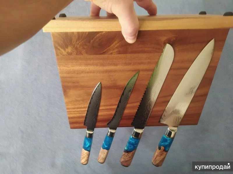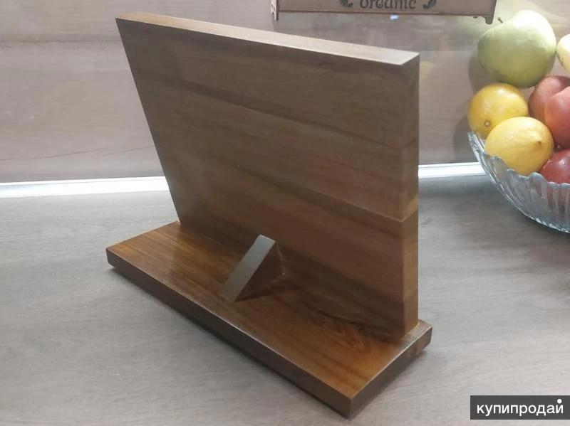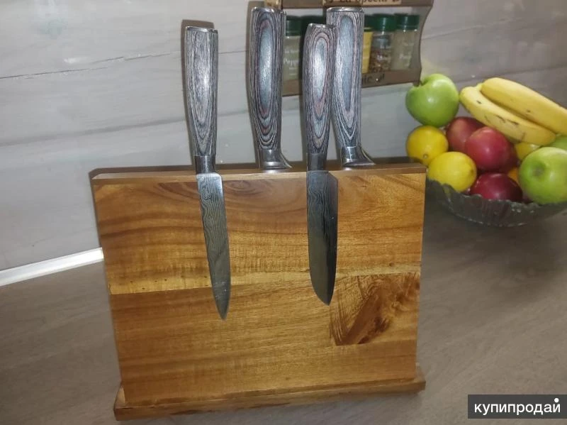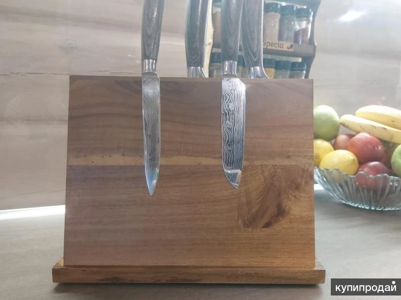Деревянная подставка для хранения ножей и других кухонных принадлежностей из металла Цена по акции, предложение актуально до 31 июля Преимущества наших подставок 1. Три линии мощнейших магнитов. 2. Хранение и сушка ножей одновременно. 3. Предотвращает затупление ножей. 4. Пропитка из минерального масла с пчелиным воском. 5. Магниты удержат любой нож даже если подставку перевернуть! ------------------------------------------- Товар в наличии на складе в Москве и Томске (количество ограничено высоким спросом). В г. Москва самовывоз – м. Багратионовская. В г. Томск самовывоз – ул. Нахимова. -------------------------------------------- Описание и характеристики деревянной подставки: Длина: 294 мм Высота: 237 мм Ширина: 105 мм Материал: массив дерева акации Покрытие: минеральное масло с добавлением пчелиного воска Цвет: коричневый, темно-коричневый Срок эксплуатации – до 10 лет (при обслуживании – масловоском) Длина лезвия (max): 235 мм Количество мест под ножи: до 6 с одной стороны ❗Смотрите другие наборы ножей дамасской стали в моем профиле❗❗