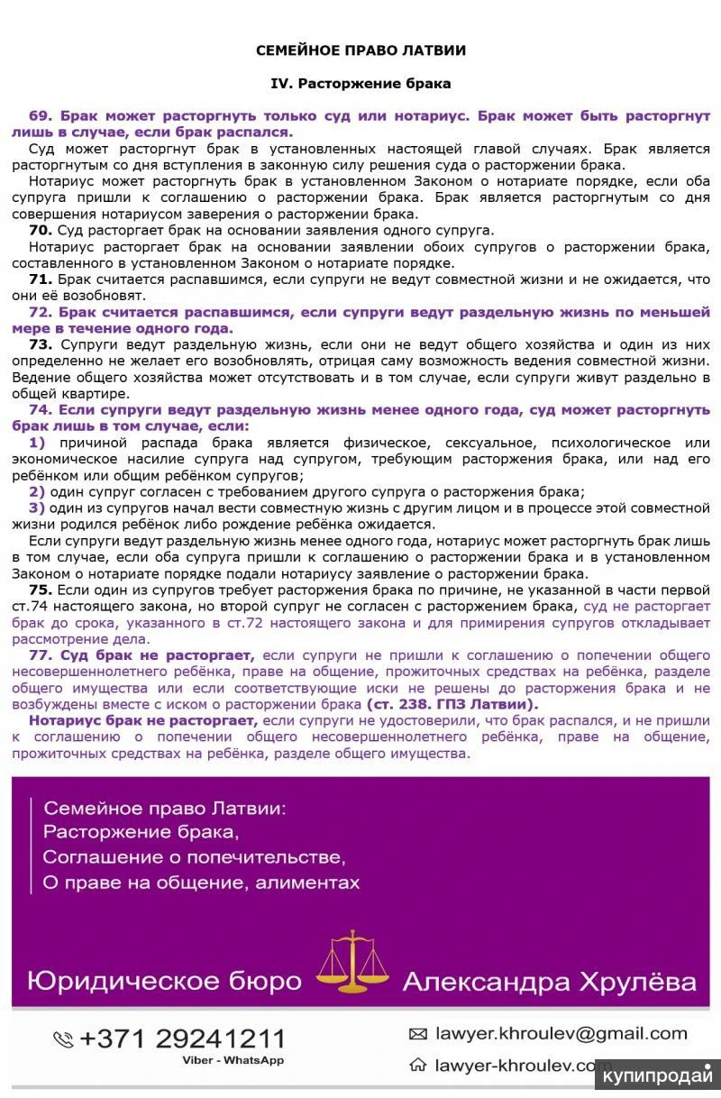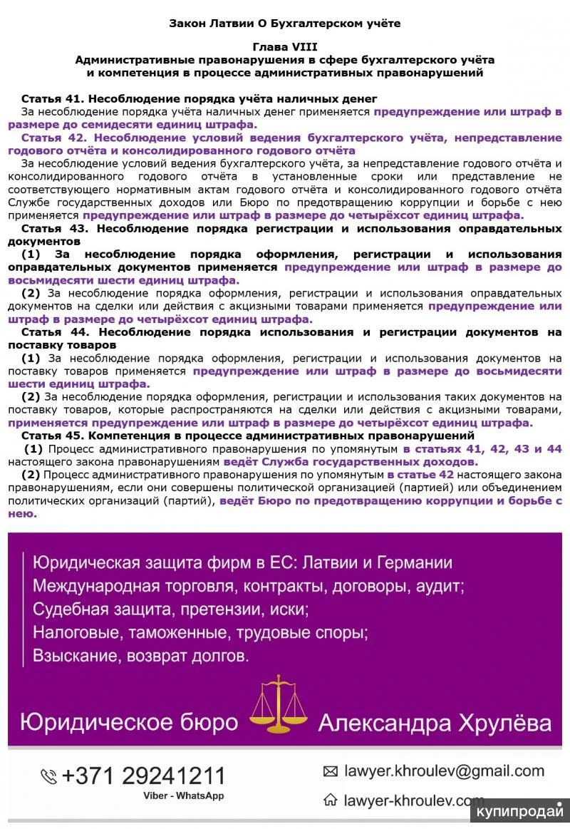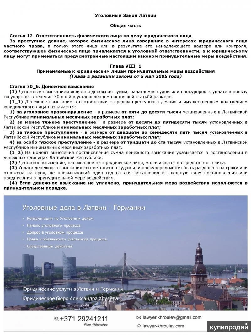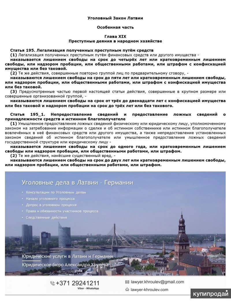 Юридические консультации онлайн в Латвии: по Уголовным, Административным, Гражданским делам – Семейное право Латвии и Германии – Налоговые, Таможенные, Финансовые, Трудовые споры (юридическая помощь во взыскании крупных долгов) – Недвижимость - Банки - Кредиты – Долги – Юридические услуги в Латвии и Германии – для физических и юридических лиц – Viber – WhatsApp – Telegram – Skype – с 12-00 до 19-00 ежедневно – предварительная запись – звонок по указанному номеру телефону в настоящей рекламе. Дистанционно подготовим и отправим на электронную почту клиента: претензии, договоры, исковые заявления в суд Латвии, отзывы на исковые заявления, соглашения, и др. – документы подготавливаются для клиентов на латышском и русском языке. Юридические услуги в Латвии – для физических и юридических лиц: 1. Юридические консультации онлайн, ведение Уголовных, Административных дел в Латвии - Риге: в области торговли, финансов, налогов, таможни, собственности, компьютерных технологий, ДТП – экономические, должностные преступления в Латвии – Налоговые, таможенные споры с Финансовой Полицией СГД Латвии, VID LR, и др. 2. Юридические консультации онлайн, ведение Гражданских дел в Латвии - Риге: 2.1. Расторжение брака, Развод в Латвии – Соглашение о попечительстве, об использовании права на общение, о средствах на содержание ребёнка в Латвии; 2.2. Банки - Кредиты - Долги - Недвижимость - ВНЖ в Латвии = Финансовые споры c Банками и управляющими компаниями в сфере недвижимости в Латвии. 3. Бизнес-консультации онлайн – Правила ведения бизнеса в ЕС: Латвии - Германии: - Юридические сделки, Международные контракты, Договоры – Юридический аудит в ЕС; - Судебная защита Компаний – Претензии, Исковые заявления в Суд; - Трудовые споры между Работодателем – Работником; - Взыскание крупных долгов в досудебном порядке, и др. Представляем интересы Клиентов в СУДЕ, МВД, ПРОКУРАТУРЕ, Финансовой Полиции СГД Латвии, VID LR, Трудовой Инспекции и Банках Латвии – тел. +371 29241211 – Viber – WhatsApp – Полный перечень юридических услуг смотреть на сайте Юридического бюро Александра Хрулёва - Латвия