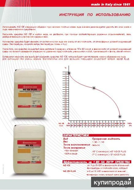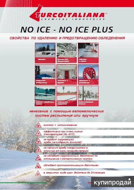 Антилед - No ice plus, экологическое средство , работает до -40°. No ice plus – это жидкость против обледенения кровли, крыши, антиобледенение водостоков, образование наледи, в борьбе с сосулями, защита ступеней и полов от льда, против сосулек для любых строительных объектов, таких как садовые дорожки, входы, гаражи, дороги, тротуары, балконы и террасы. Его формула не оказывает пагубного влияния на окружающую среду: не содержит хлоридов, сульфатов и нитритов, фосфора, серы, азота, карбамидов, гликолей, поверхностно активных веществ, натрия, кальция. Экологически чистое средство, наносится на обледенелые или заснеженные поверхности, после чего происходит удаление снега и льда, с образованием смеси из воды и средства, которое замедлит образование нового обледенения в зависимости от соотношения воды и данного средства. количество зависит от состояния слоя снега или льда, его плотности, от атмосферных и погодных условий. Нанесения средства: разбрызгиватель или лейка эффективность - 1 л. средства на 5-20 кв м в зависимости от температуры и плотности снежного слоя.
