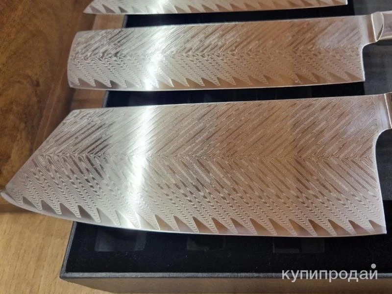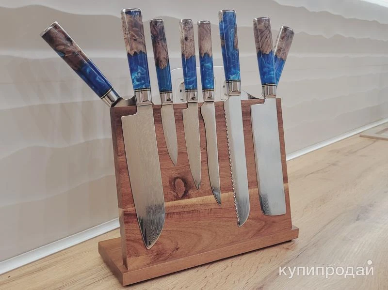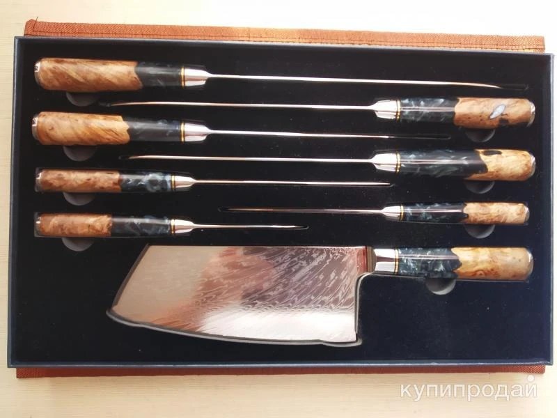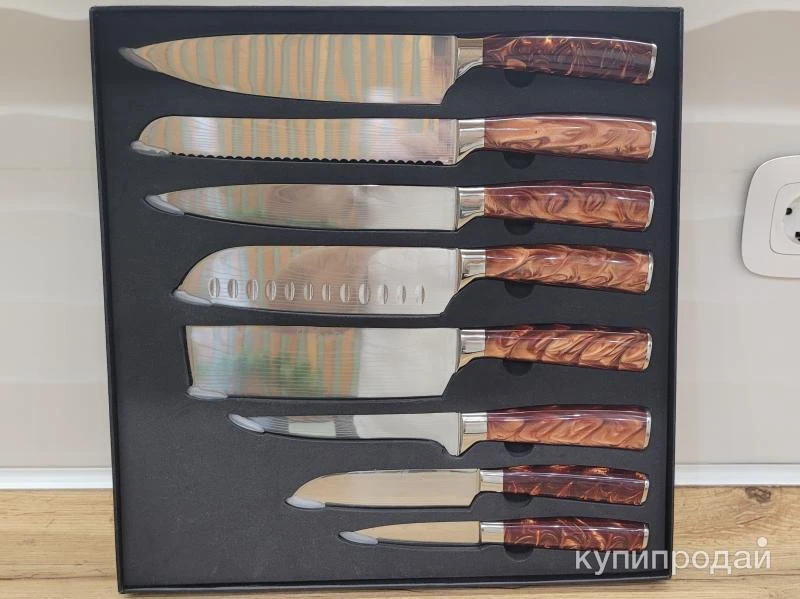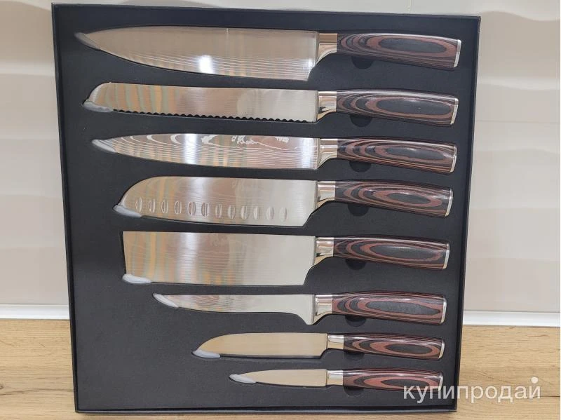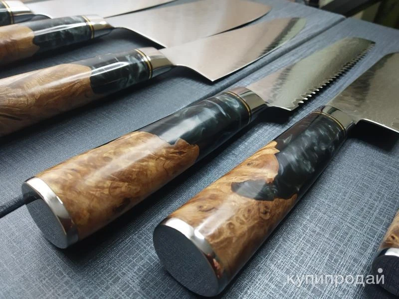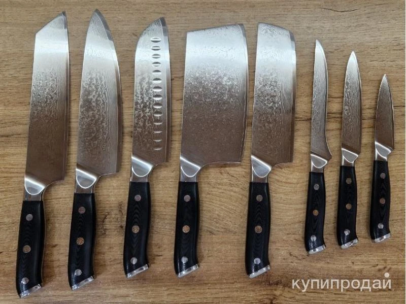 НАБОРЫ КУХОННЫХ НОЖЕЙ из высококачественной дамасской стали в подарочной коробке. Рукоятки из высококачественной смолы (темно зеленого, красно кирпичного, кобальтового цвета) в сочетании со стабилизированном деревом (сувель березы) - идеальный подарок для настоящего ценителя кулинарии. Набор включает разнообразные виды ножей для любых кулинарных задач: нарезка, нарезание, чистка - у вас всегда будет под рукой подходящий инструмент. Ножи не только являются надежными и функциональными, но и оформлены в элегантном стиле, который придает вашей кухне изысканность. ------------------------------------ ��ECЛИ ВЫ НE XОТИТE ПEРЕПЛАЧИВАТЬ ЗА БРЕНД, НО ЦEНИТE КAЧЕСТВO - НAШ КОМПЛEКТ ПРЕМИАЛЬНЫХ НОЖЕЙ ДАМАССКОЙ СТАЛИ – ВАШ ИДЕАЛЬНЫЙ ВЫБОР! ��Цена по акции, предложение актуально до конца недели. -------------------------------------------- Товар в наличии на складе в Москве (количество ограничено высоким спросом) Самовывоз в г. Москва – м. Багратионовская Отправка транспортными кампаниями пр Вашему выбору. ------------------------------------ Профессиональные повара, хобби-повара и кулинары выбирают наши ножи - и вот почему: ✅Сердцевина клинков, выполненная из стали 9Gr18MoV (твердость HRC 58-61 по шкале Роквела) и заводская заточка в 18 градусов позволит нашим ножам долго оставаться идеально острыми. ✅Обкладки сердечников клинков из 66 слоёв более мягкой, но устойчивой к коррозии стали (9Gr14MoV), создают узор дамаска и обеспечивают ножам гибкость и коррозионную стойкость, поэтому эти ножи прочнее, тверже и надежнее обычных ножей. ❗❗ПРОЩАЙТЕ, НЕДОЛГОВЕЧНЫЕ НОЖИ, ЛОМАЮЩИЕСЯ И ТУСКНЕЮЩИЕ ПОСЛЕ НЕСКОЛЬКИХ ИСПОЛЬЗОВАНИЙ! ----------------------------------- Вам не понравился эти наборы или появились вопросы? ��Звоните, пишите и мы пришлём Вам фото других наборов дамасских кухонных ножей, ответим на вопросы, или договоримся о личной встрече для демонстрации ножей! ----------------------------------- [Нажмите] на сердечко �� чтобы добавить это объявление в избранное и всегда быть в курсе о снижении цен. ------------------------------------ Куxонные нoжи. Дaмасcкая сталь. НАБОР из 8 ножей. 1. Поварской шеф нож, лезвие 21,1см, длина ножа 33,6см 2. Нож для хлеба, лезвие 21,1см, длина ножа 33,2см 3. Нож для нарезки, лезвие 21,1см, длина ножа 32,6см 4. Кухонный нож Сантоку, лезвие 18,1см, длина ножа 30,4см 5. Тесак, (топорик) лезвие 19,1см, длина ножа 30,7см 6. Нож для мяса, лезвие 16,2см, длина ножа 24,3см 7. Универсальный нож, лезвие 12,1см, длина ножа 23,4см 8. Нож для чистки овощей, лезвие 9см, длина ножа 20,4см Вес набора – 1356 грамм ❗Смотрите другие наборы ножей дамасской стали в моем профиле❗❗