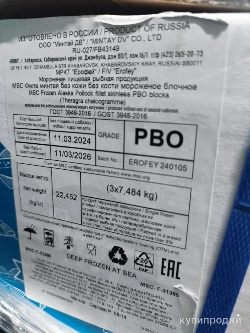 Компания ТСЛ, торговый дом Новосибирского хладокомбината, предлагает со склада в Подольске Минтай филе МРКТ Ерофей РФ 1/22,452 (3*7,484) Цена с ПРР, НДС, вет справкой