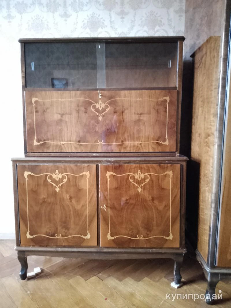 СРОЧНО и выгодно! Винтажный гаpнитуp из маcсивa дерeвa, с инкрустацией и изящными ножками. В комплект входят: 1. Большой раздвижной обеденный стол с 4-мя стульями (20000 руб.) 2. Буфет (5000 руб.) 3. Спальный гарнитур: две кровати с матрасами, могут использоваться как двуспальная кровать (10000 руб.), шкаф бельевой (6000 руб.) и трельяж - 4000 руб. 3. Секретер - 5000 руб. (требуется замена замка у вехнего отделения). Мебель в хорошем состоянии, понравится любителям ретро, идеально подходит для переделки на свой вкус! Самовывоз (7-й этаж, без грузового лифта).