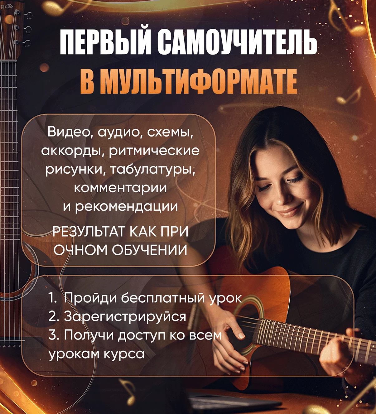 Вас ждут развернутые уроки по изучению аккордов, связыванию аккордов в цепочки и приемов исполнения аккомпанемента, и песенный репертуар для закрепления материала.