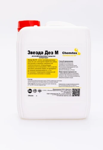 Средство используется при профилактической дезинфекции на предприятиях пищевой промышленности для обработки поверхности технологического оборудования, производственные ёмкостей, тары, кузовов транспортных средств используется 0,1-3% раствор «Звезда Дез М». Время обработки от 3 до 20 минут при температуре 15 – 70°С. В автобарьеры, дезковрики заливается 0,2-0,5% препарата. Водный раствор стабилен в течение 15 дней, заменяется по мере загрязнения.