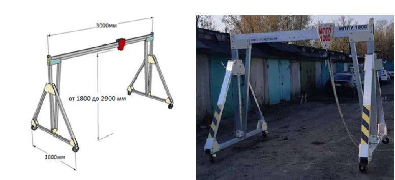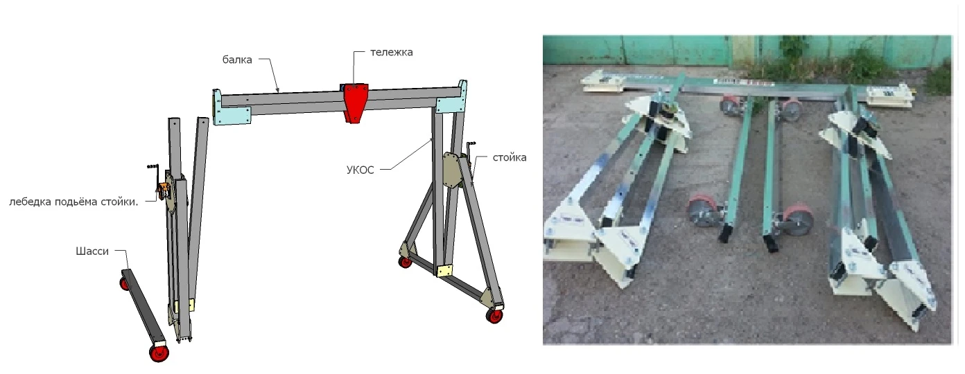 Регулируется по высоте и ширине пролёта. Полностью разборная конструкция. Поставка разборном виде: Балка с тележкой г/п 1.тонны 1шт., стойка А образная с укосом- 2шт. Шасси на усиленных поворотных, колесных , с тормозом 2шт.Таль цепная талью, с ручным приводом , грузоподъёмностью не более 1 т.