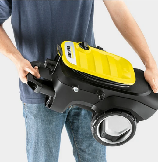 Шланг аккуратно наматывается на корпус и фиксируется эластичной стяжкой. Портативная мойка устойчиво работает как вертикально, так и горизонтально, а удобные боковые рукоятки делают переноску легкой и безопасной.