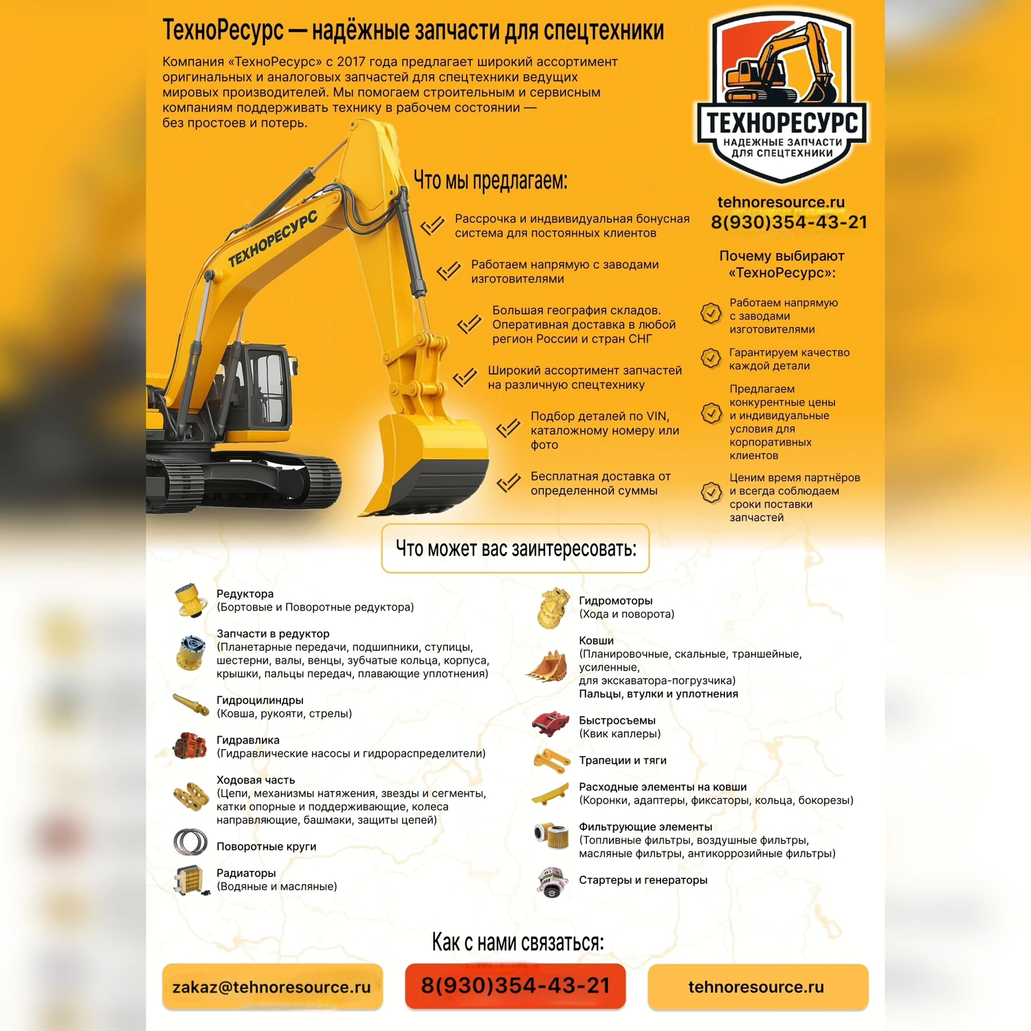 Компания "ТехноРесурс" с 2017 предлагает широкий ассортимент оригинальных и аналоговых запчастей для спецтехники ведущих мировых производителей. Мы помогаем строительным и сервисным компаниям поддерживать технику в рабочем состоянии - без простоев и потерь.