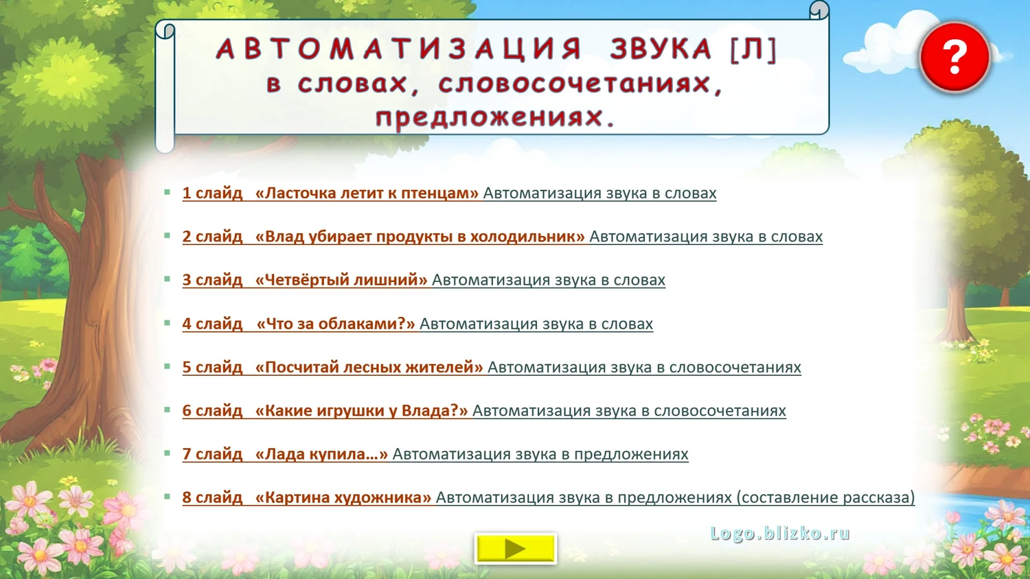 Логопедическое интерактивное пособие для автоматизации звука Л в словах, словосочетаниях, предложениях для детей дошкольного возраста. В пособии 8 рабочих слайдов, направленных на закрепление звука по традиционной в логопедии схеме. Формат пособия предусматривает многократное использование.