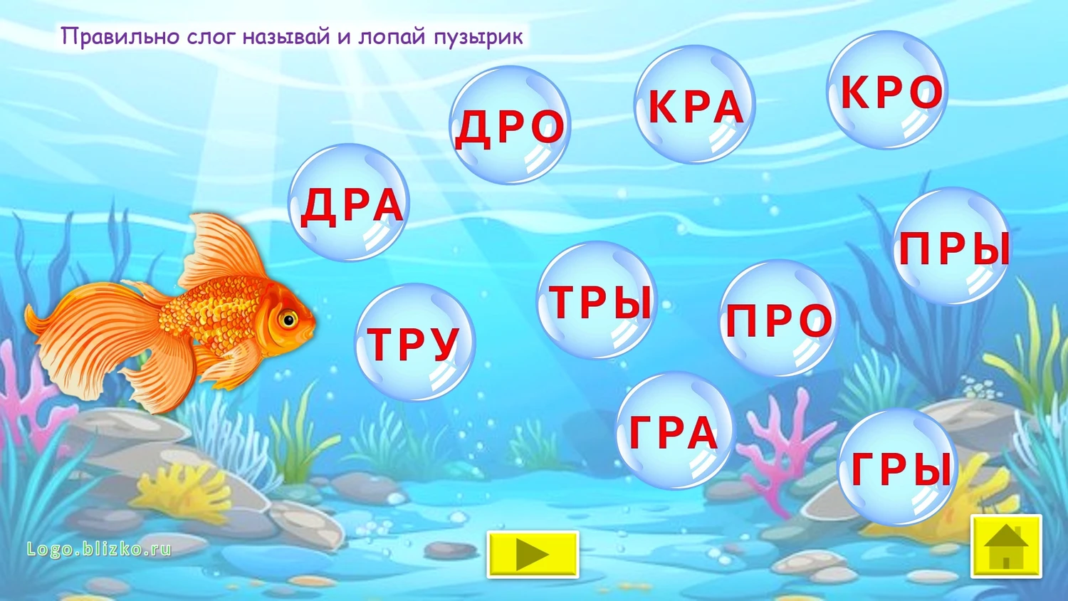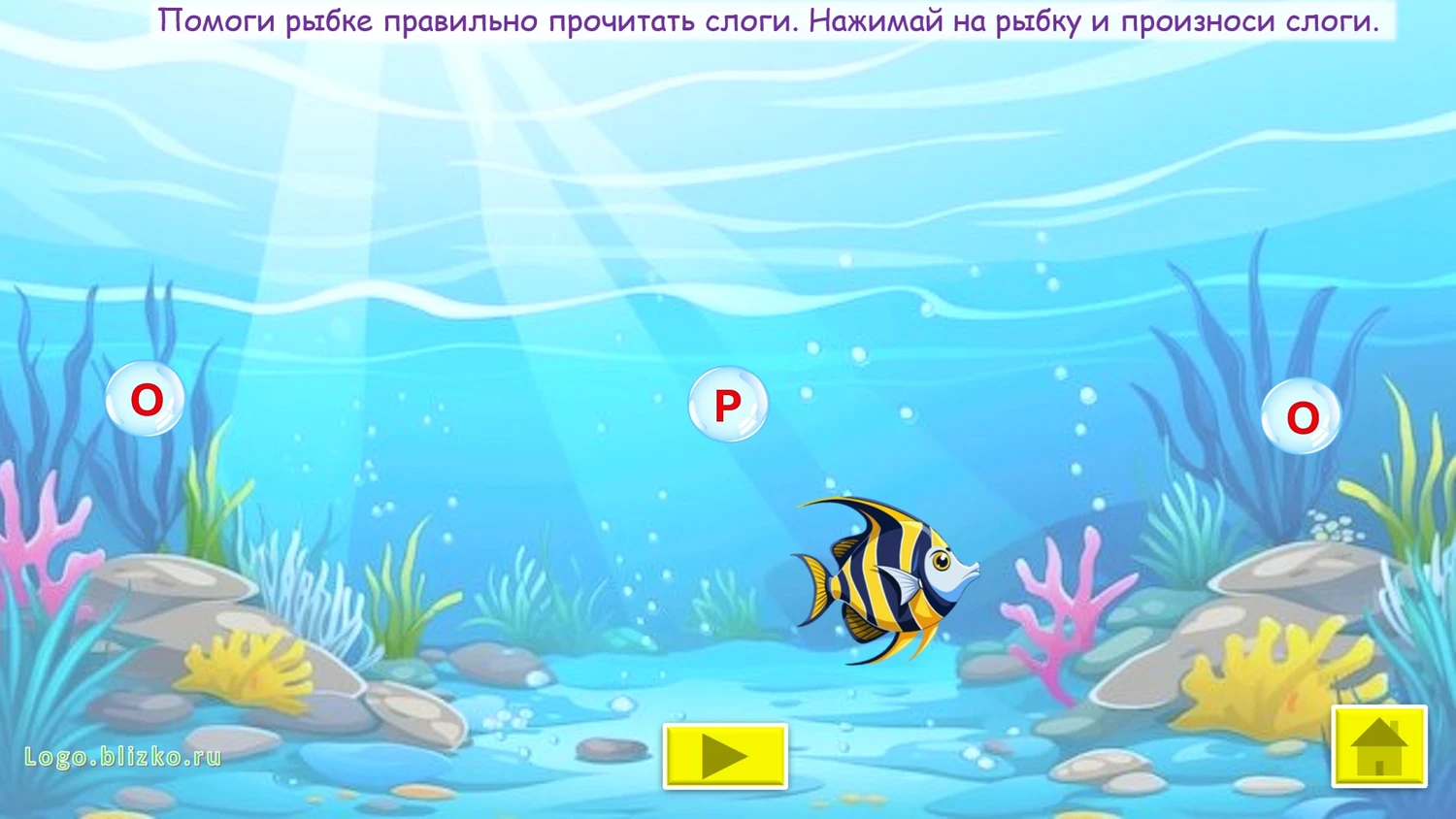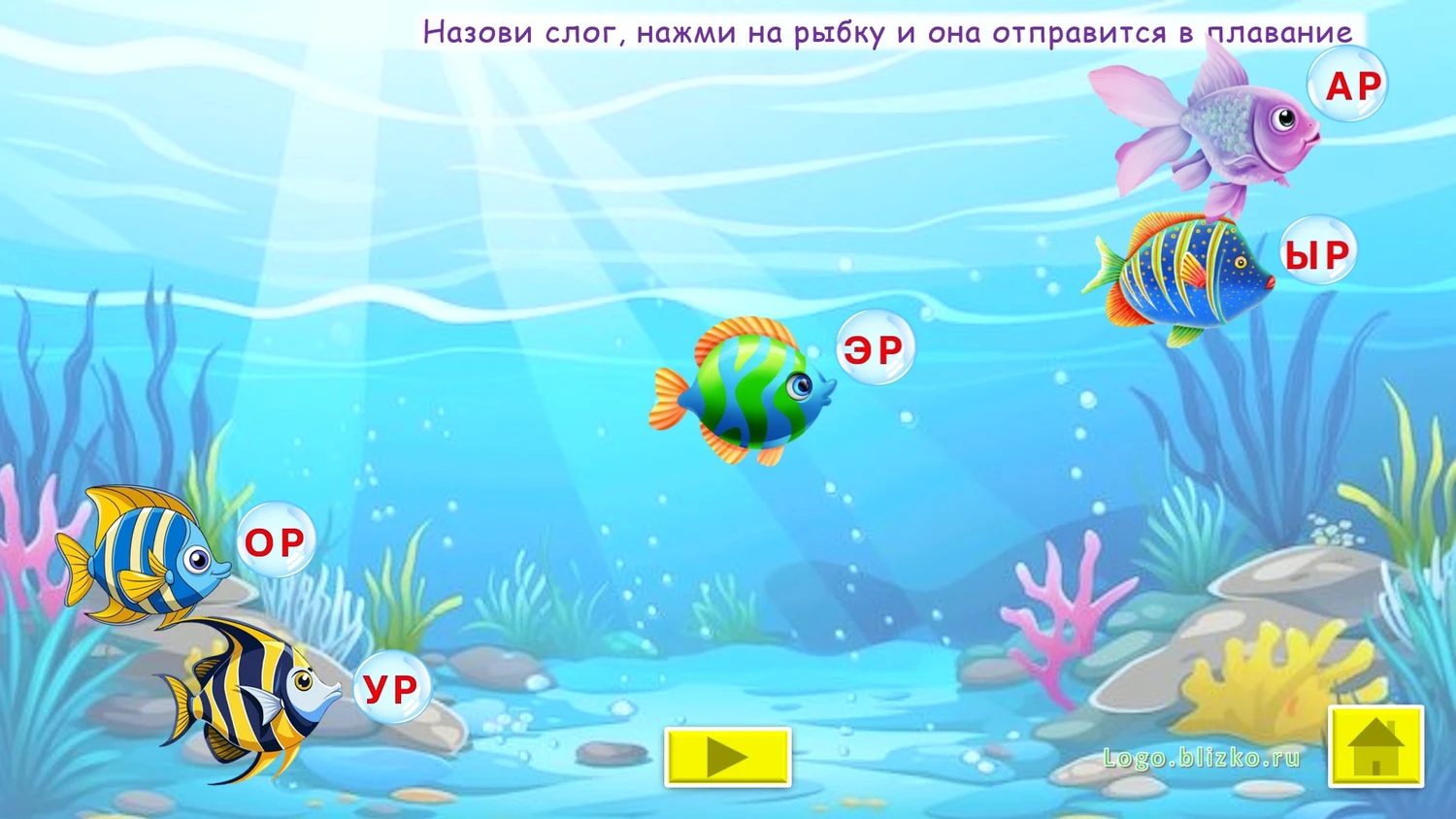 Ребенок, играя, выполняет необходимые шаги (например, помогает рыбке отправиться в плавание и др.), проговаривая слоги, тем самым звук закрепляется, автоматизируется. Взрослый контролирует правильность произнесения звука. При необходимости можно выйти в главное меню и повторить любое из упражнений сначала. Можно последовательно идти по слайдам.