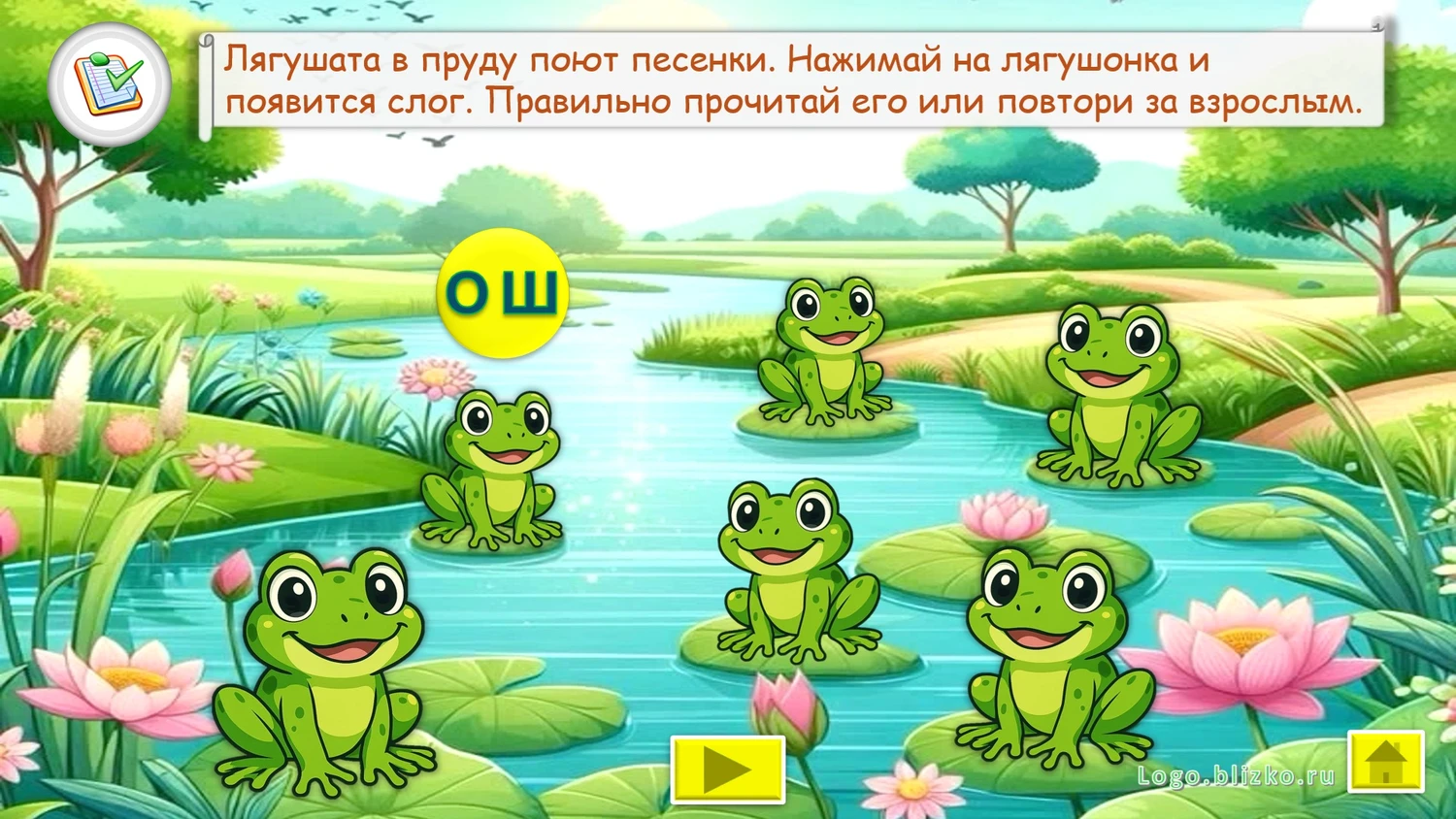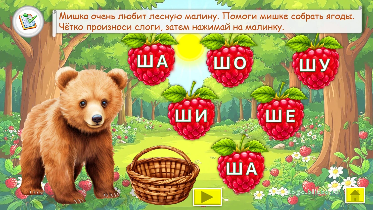 Ребенок, играя, выполняет необходимые шаги (например, помогает мишке собрать малину и др.), проговаривая слоги, тем самым звук закрепляется, автоматизируется. Взрослый контролирует правильность произнесения звука. При необходимости можно выйти в главное меню и повторить любое из упражнений сначала. Можно последовательно идти по слайдам.