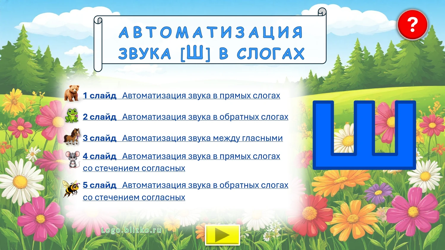 Логопедическое интерактивное пособие для автоматизации звука Ш в слогах у детей дошкольного и младшего школьного возраста. В пособии 5 рабочих слайдов, направленных на закрепление звука по традиционной в логопедии схеме. Формат пособия предусматривает многократное использование.