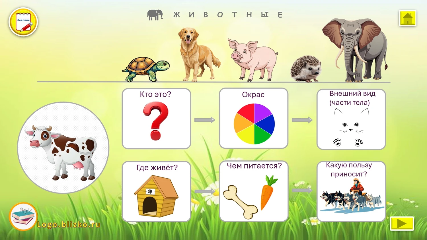 Каждый слайд содержит инструкцию (задание), а также пример описательного рассказа.