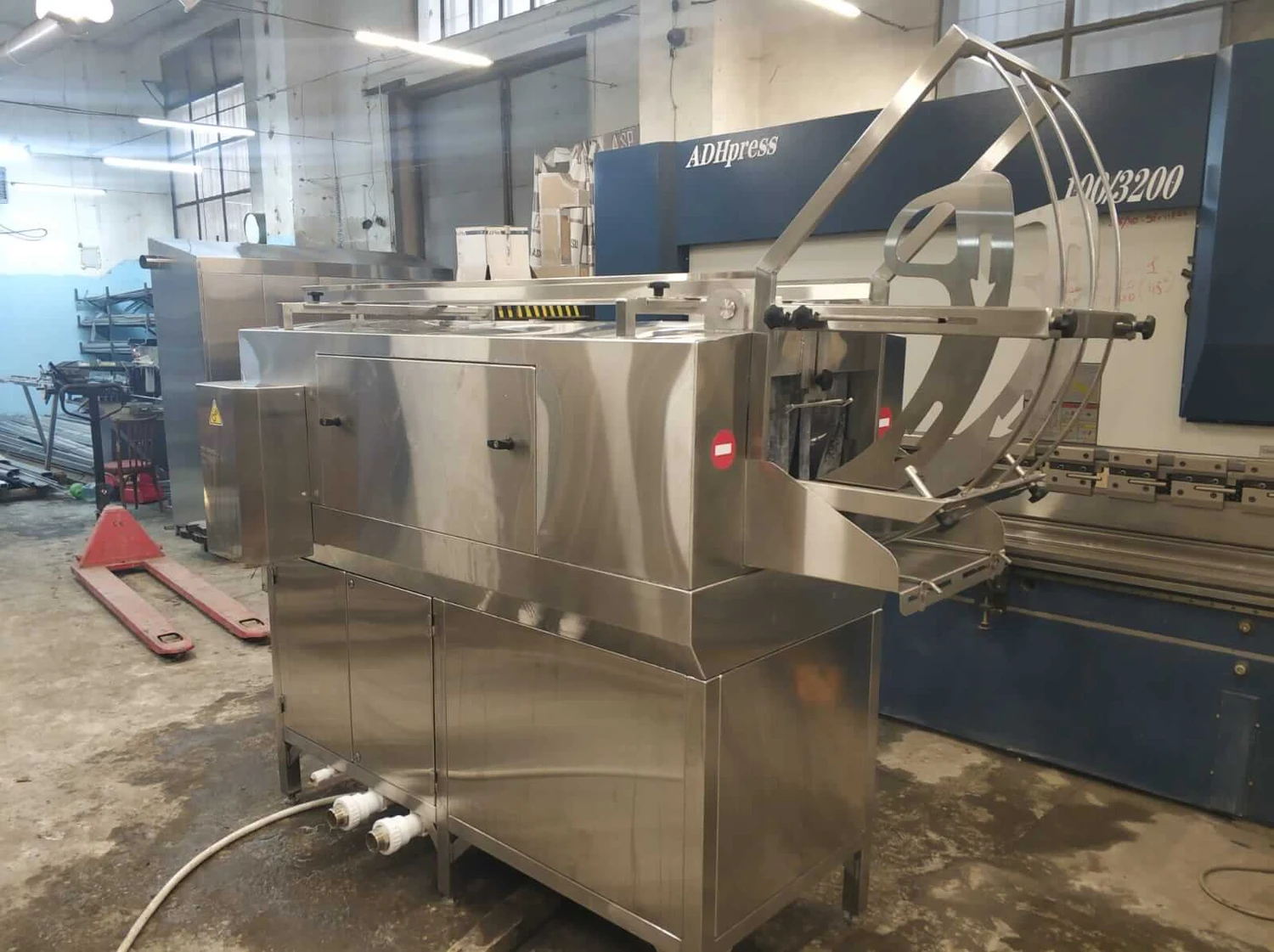 Оператор подает тару в зону мойки. При помощи цепной передачи ящик будет продвигаться по "туннелю" внутри машины. Скорость продвижения тары регулируется частотником. В зоне мойки моющий раствор подается под давлением 3-5 бар через форсунки на корпус тары. При этом температура воды в диапазоне 50-60 С. Оптимальным будет использование горячей воды из системы предприятия. Расход и концентрация моющего средства регулируется дозатором, что позволяет предотвратить излишний расход. Для нормального функционирования машина подающаяся из системы предприятия вода должна быть температурой не менее +40 С.