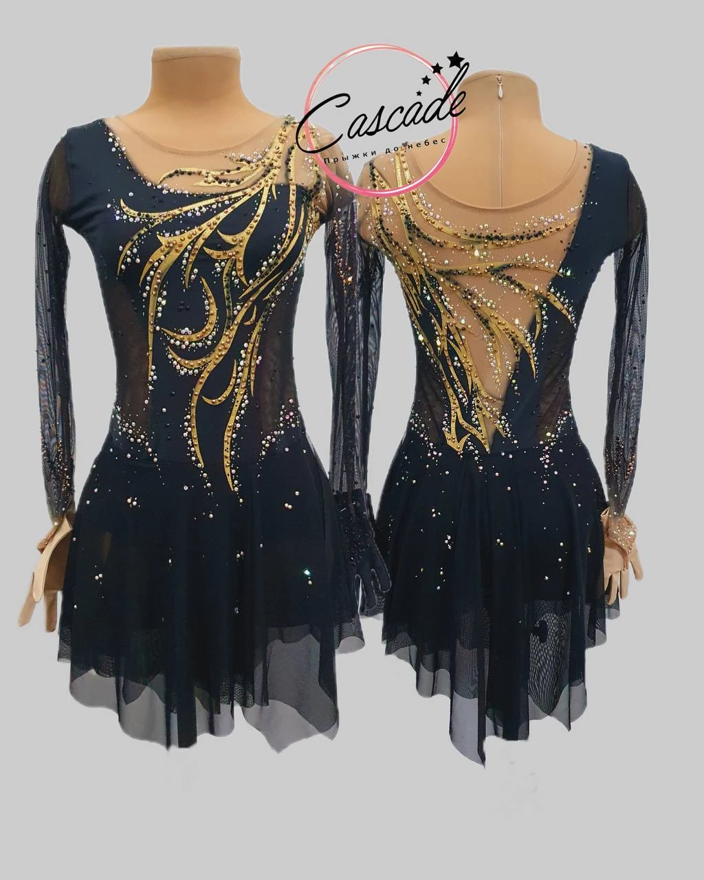 Платье для фигурного катания Лидия от бренда Cascade создано для тех, кто выбирает на льду образ уверенной и загадочной победительницы. Глубокий черный цвет в сочетании с мерцанием страз создает эффект звездного неба, приковывая взгляды судей и зрителей с первой секунды программы.