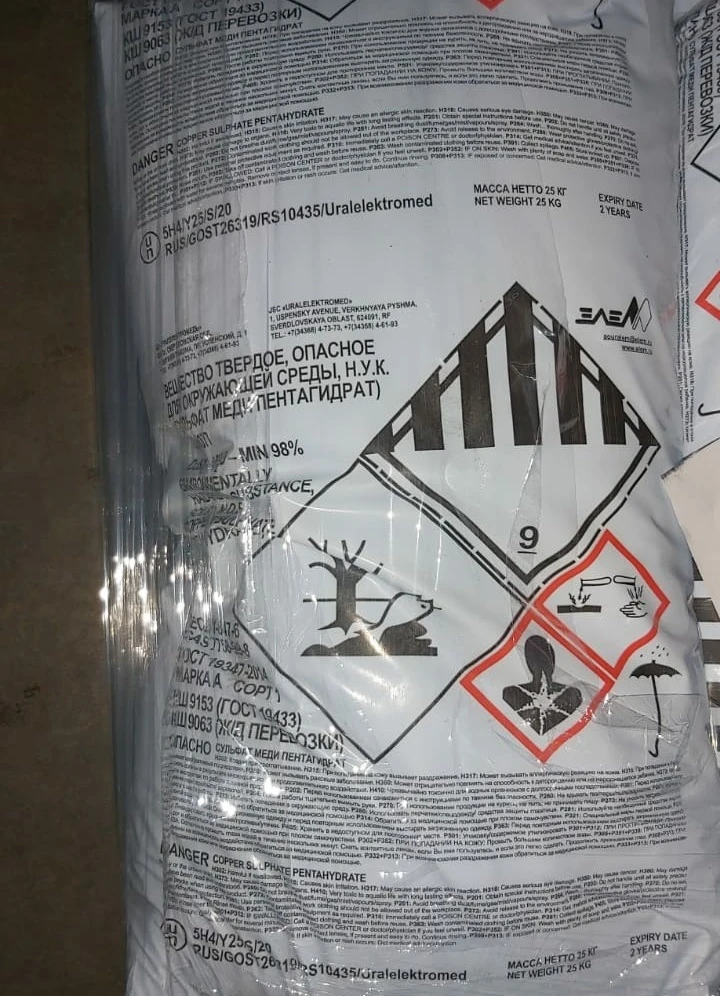 Медь сернокислая (медный купорос, сульфат меди, медная соль серной кислоты, copper(II) sulfate, CAS 7758-98-7), Россия, Китай, ЕС, мешки по 25 кг. Существующие нормативные документы: ГОСТ 19347-99