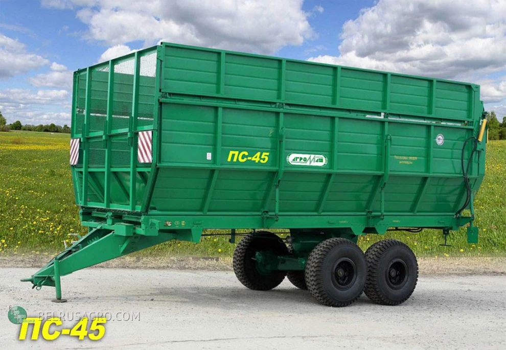 Полуприцеп специальный ПС-45, предназначен для приема и транспортировки измельченной массы кормовых культур от кормоуборочных комбайнов КСК-100, «Полесье», «Ягуар» и других с последующей выгрузкой назад транспортерами, а также для последующей транспортировки к месту хранения и загрузки в приемный бункер упаковщика силосно-сенажной массы УСМ-1 или аналогичных машин и для перевозки других легковесных грузов с удельной массой до 400 кг/м3.