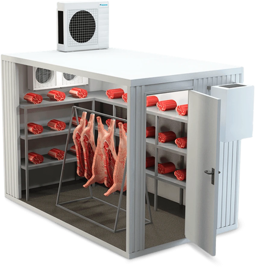 * Холодильные Камеры Для Хранения Мяса: Эти Камеры Предназначены для кратковременного хранения мяса и работают при температуре от 0 до +5 °C с относительной влажностью от 75% до 100%. Мы предлагаем камеры разных размеров, которые могут быть индивидуально подстроены под вашу задачу.