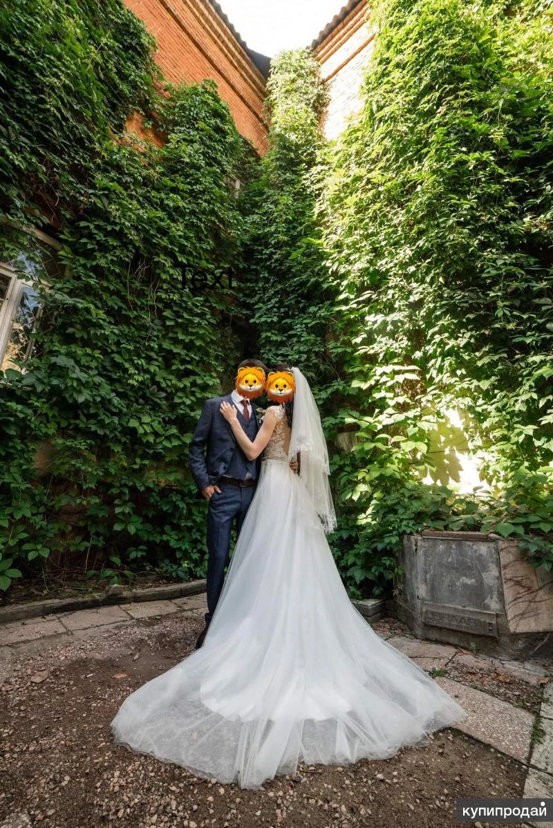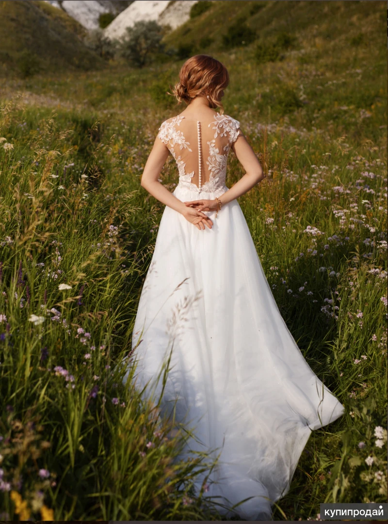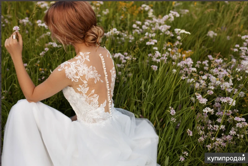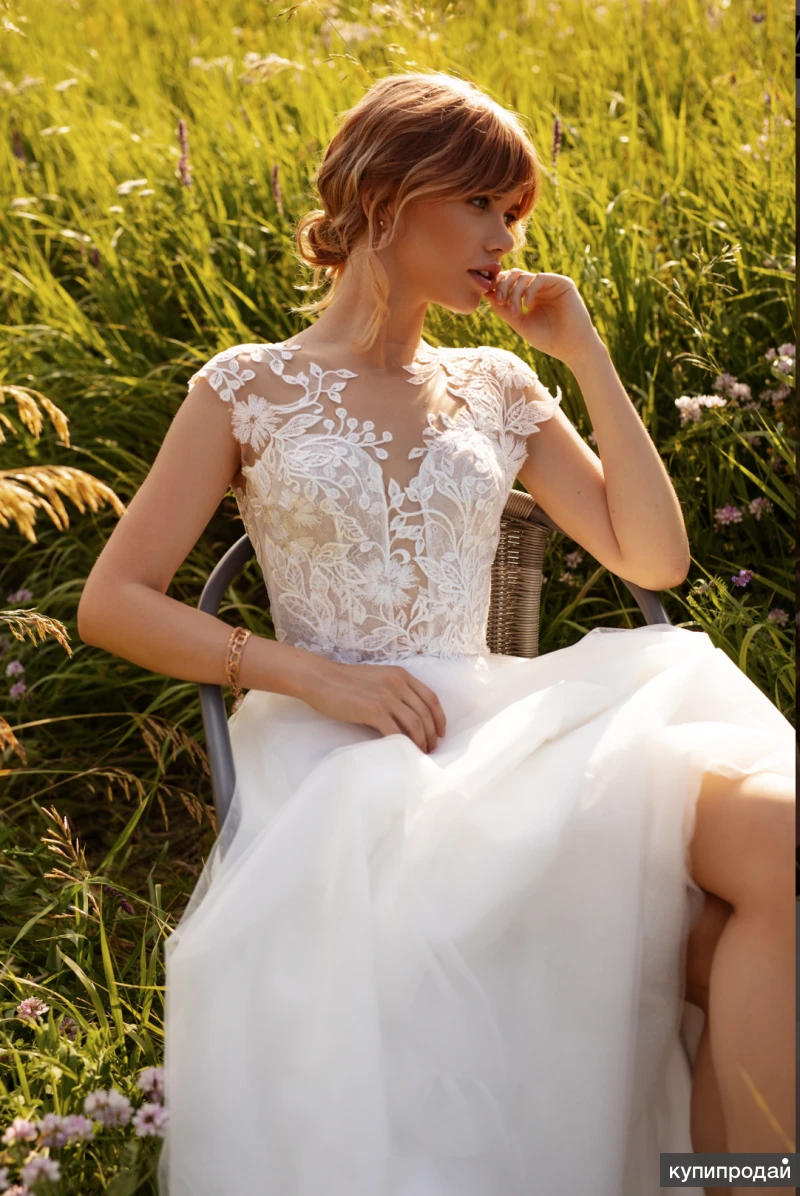 Дизайнер: Анна Кузнецова Коллекция: WILD AND TENDER, Kirsti Размер: S (42–44) Состояние: после химчистки, в отличном состоянии, кольца в подарок Приталенное свадебное платье с короткими рукавами и прозрачной спинкой. Лиф с эффектом прозрачности декорирован ажурной вышивкой с цветочным узором и дополнен гипюровой подкладкой. По прозрачной спинке спускается до линии талии ряд пуговиц-жемчужин. Легкая юбка из многослойного тюля плавно расширяется и оканчивается шлейфом.