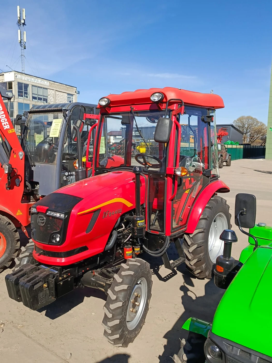 Минитракторы Dong feng 244 с кабиной укомплектованы кабиной с отоплением, гидроусилителем руля (ГУР), полноприводной (4х4) механической КПП (4+1) с пониженным и повышенным рядами, герметичной колодочной тормозной системой, с/х шинами, размерностью 6.5-16 на передней оси и 11.2-24 на задней оси, блокировкой заднего дифференциала и задним 2-х скоростным ВОМ.