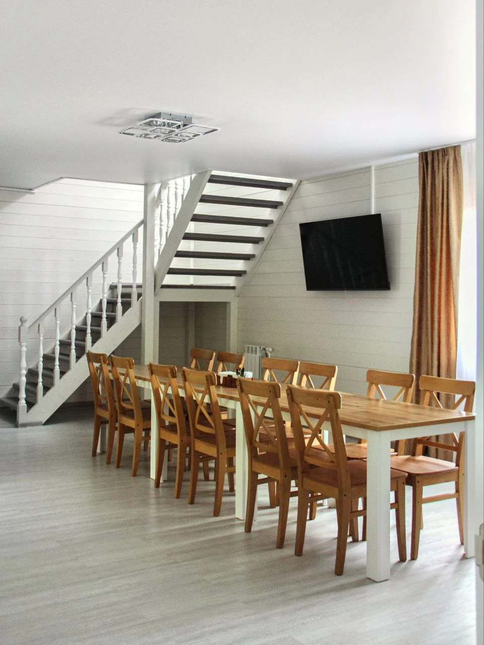 • Большая гостиная со смарт телевизором, диваном, столом и стульями;