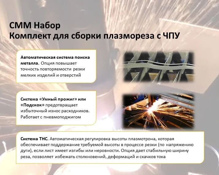 В станках серии «СММ Набор» есть опция «Подскок» или «Умный прожиг», работающая исключительно с аппаратами плазмы с пневмоподжигом. Функция значительно продлевает срок службы расходных материалов. Она заключается в подъёме резака над материалом сразу после установления дуги и защищает сопло от брызг раскаленного металла.