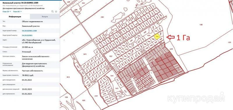 Продается большой участок 100 соток (1Га), в живописном месте на окраине Ордынки, в 110 км. от Новосибирска. Хорошая грунтовая дорога до участка. Ровный рельеф на участке, сам участок -100Х100м. Категория земель: -земли сельскохозяйственного назначения. Разрешенное использование: - для ведения крестьянского (фермерского) хозяйства. Кадастровый номер: 54:20:020901:1589. Координаты участка для просмотра и проезда: Широта: 54,3356° Долгота: 81,7891°. (улица Цветочная). Есть градостроительный план ЗУ. На участке есть небольшая времянка. Электричество подведено. С левой стороны есть соседи, у них два участка, ведут хозяйство. Очень красивый вид с участка, просто захватывает дух от ощущения свободы. Летом приятный аромат лугового разнотравья. До трассы 1350 м, до Обского моря 950 м. Покупка участка – это очень выгодное вложение. Вы не просто становитесь владельцем участка своей мечты, но и застраховываете свои денежные средства. Потом, если это потребуется, вы всегда сможете продать ваш участок и получить прибыль с этой продажи. Так что в любом случае вы остаетесь в плюсе. Если вы хотите приобрести земельный участок для создания своего бизнеса, то это самый отличный вариант. Звоните, чтобы узнать больше информации и договориться о встрече. Возможен обмен на авто или другую недвижимость. Очень перспективное место. ЦЕНА ДЕЙСТВИТЕЛЬНА ДО КОНЦА МЕСЯЦА!!!