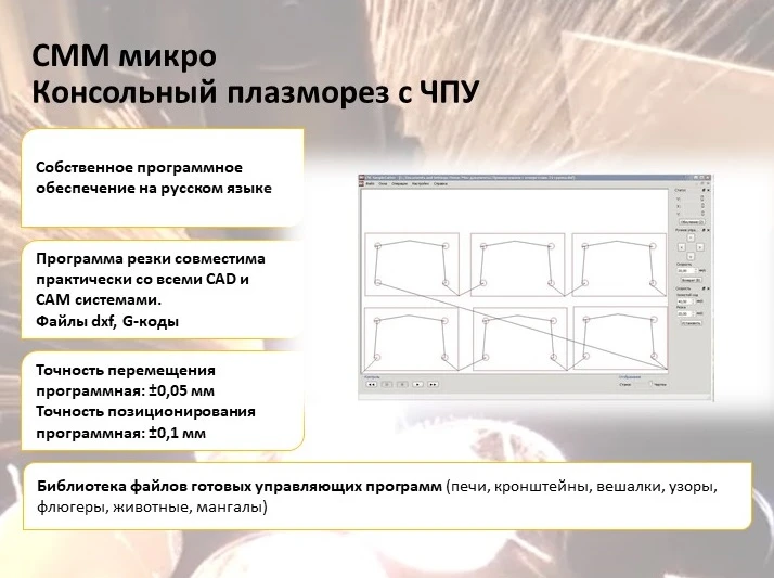 •Библиотека файлов управляющих программ (мангалы, печи, кронштейны, вешалки, узоры, флюгеры, животные).