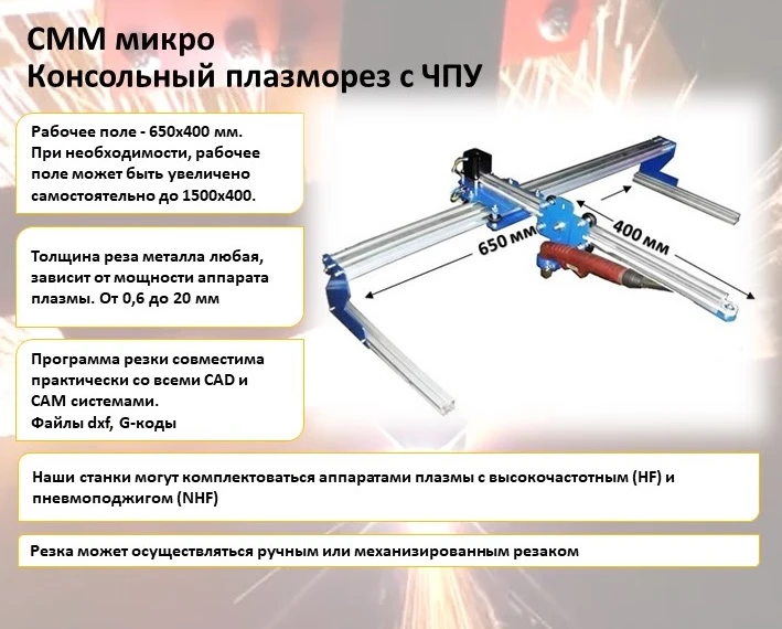 2) Любой плазморез с высокочастотным поджигом, ручным резаком и дежурной дугой из наличия у Вас. Либо приобретается отдельно. Стоимость по рынку от 10 000 руб. В идеале лучше приобрести аппарат с пневмоподжигом. Не дает помех. Стоимость от 20 000 руб.