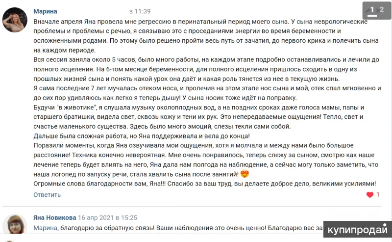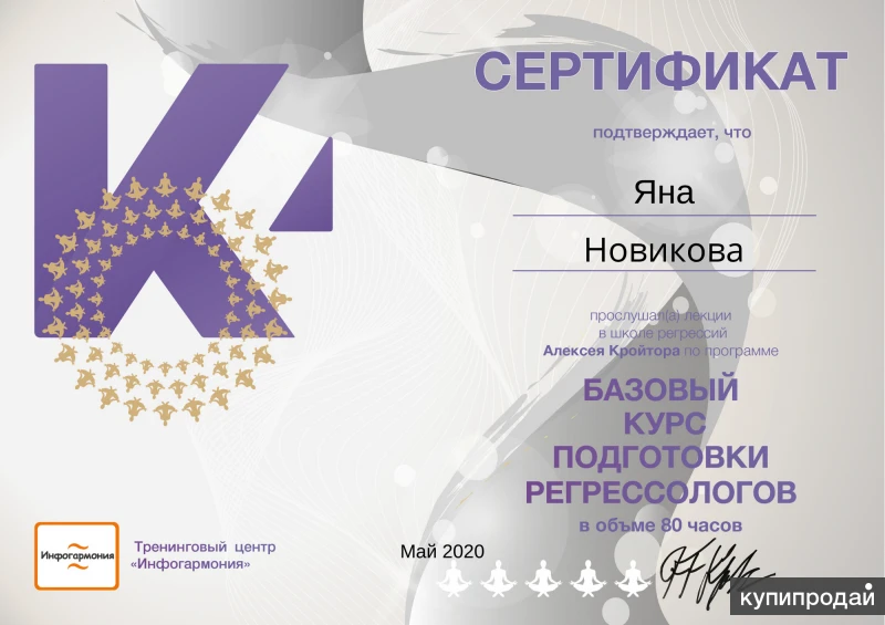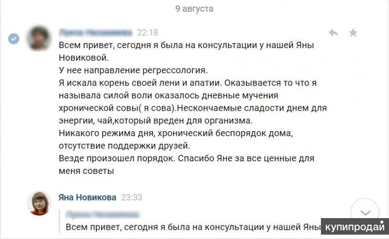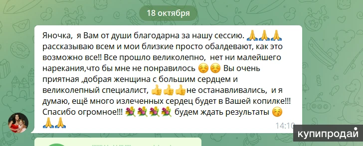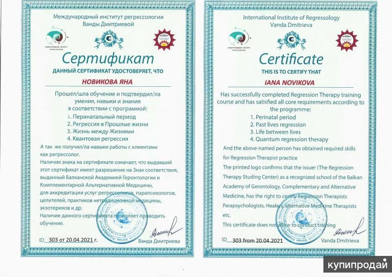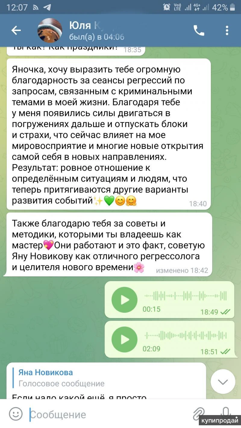 Сеанс примерно 3 часа по скайпу. Перед сессией обязательная консультация длительностью примерно 1,5 часа. -Фотоанализ ваших фотографий. Делаю классический фотоанализ, без танцев с бубнами, использования ясновидения, магических штучек. Я подробно рассказываю, что и откуда беру, сами потом видите на своих фото. От вас только нужны будут фото и видео, я подробно рассказываю какие. Регрессия и ее виды: -Возрастная регрессия. Здесь мы можем исцелить тяжелые воспоминания о трагическом событии. -Перинатальный период. Травмы при рождении, при зачатии, при вынашивании беременности. Существует 20 Базовых Жизненных Установок или программ, которые человек получает при рождении. Эта сессия долгая, занимает минимум 5 часов. Кто-то называет это перерождением. Что дает? Человек начинает жить в новом будущем, где нет тех установок, которые его тянули назад. Эта сессия меняет людей на генетическом уровне. Цена 7 тыс руб. -Выбор вариантов. Эта сессия дает возможность выбора между несколькими "дорогами". Цена от 3 тыс руб, зависит от количества выборов погружаемого. -Прогрессия в будущее. Можно в ней посмотреть какие события на разных веточках развития будущего происходят, связанные с запросом. Выбрать тот наилучший вариант и понять, каких ресурсов не хватает. Цена 4 тыс. -Родовая система. Знакомство с Родом, возврат тех, кто ушел из Рода по каким-то, не зависящим от него причинам. Знакомство с Прародителями, расчистка заторов энергии, если таковые есть, получение и дарение подарков. Длительная сессия, примерно на 4 часа. Я потом рассказываю, как работать самостоятельно с Родовой системой. Цена 4 тыс. Что дает? Избавление от Родовых повторяющихся сценариев. -Регрессия в прошлые жизни. Идем до корня. Что дает? Так же, как и возрастная регрессия снимает напряжение и человек начинает жить из новых ресурсов, меняется. -Психосоматика. Часто, причина наших недугов кроется в прошлых воплощениях. Проработав там, человек избавляется от своих недугов, зависимостей, фобий. -Распутывание кармических узлов. Посмотрев, что связывает человека с другим, какие обеты, обещания, любовь, ненависть завязали узел, человек становится свободным. Цена 4 тыс руб. -Жизнь между жизнями или ЖМЖ. Сюда выходят люди, если им нужен ответ на вопрос, который "мучит" человека, например-предназначение. Встреча с умершими. Цена 4 тыс. -Взятие необычных способностей. Цена 4 тыс руб -Выход к Наставникам, получение Печати, Имя Души, выход в более высокие слои Ангелов, Архангелов, Духа и Господа. Эта сессия для искушенных, тем кто уже не интересуется материальным, а им нужно духовное. Меняется у людей представление об этом Мире. Цена 4 тыс руб. Метод регрессии-это очень экологичный метод для всех участников событий. Изменения происходят мягко. Людей не "бьет" мордой об асфальт. Извините за сленг! Все происходит постепенно для всех! И этому методу все равно, верите в него или нет. Изменения происходят ВСЕГДА! Можно брать комплектом, тогда есть скидка. Узнавать через личные сообщения