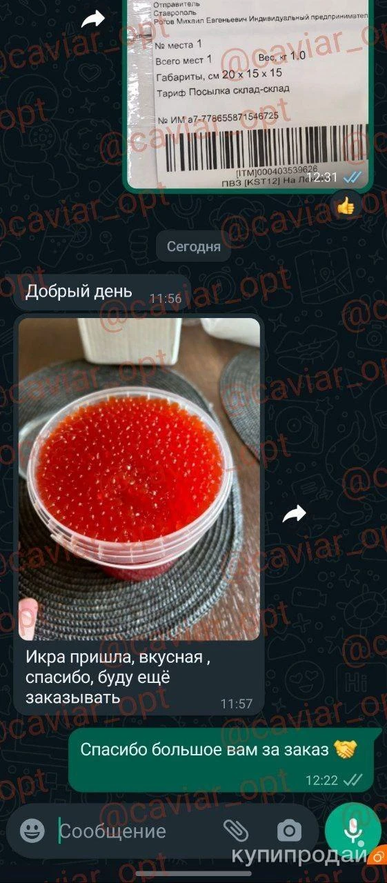 ИКРА РЫБ ЛОСОСЕВЫХ ПОРОД! ПОЛНОСТЬЮ ИДЕНТИЧНА НАТУРАЛЬНОЙ, ТАК ЖЕ ЛОПАЕТСЯ ВО РТУ! СОБСТВЕННОЕ ПРОИЗВОДСТВО! ЛЮКС КАЧЕСТВО! _ ?Если хотите попробовать действительно ВКУСНУЮ икру, а не магазинную имитацию, ПИШИТЕ , проконсультируем Вас по всем вопросам! МИНИМАЛЬНЫЙ заказ от 5 кг (возможна отправка пробника 1кг) _ ПОЧЕМУ ВЫБИРАЮТ НАС: ✅ Опыт. Мы официальные производители икры, не первый год на рынке, наша икра экологически чистая и сертифицированная? ✅ Качество. Премиальное качество. Не пересоленная, без запаха тины, все по ГОСТу. ✅ Оперативность. Стабильные поставки в любом объеме от 1 до 3 дней прямо в Ваш город. ✅ Лучшая цена. За счет собственного производства, можем предложить лучшую цену на рынке! СКИДКИ на крупный Опт! ? Доставка по РФ СДЕКом ✔️Гарантия качества Если с товаром, посылкой что-то случится в дороге, мы возьмем всю ответственность на себя и полностью компенсируем вам это, отправим новую посылку. Нам важна наша репутация!