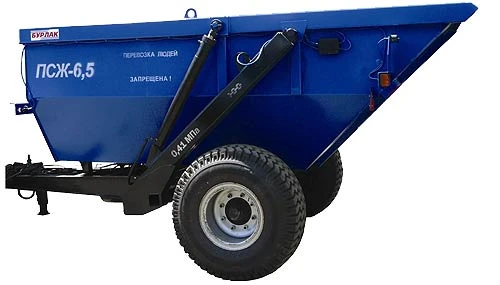 Полуприцеп тракторный самосвальный ПТСЖ-6,5 предназначен для перевозки и выгрузки назад любых жидких, полужидких и сыпучих сельскохозяйственных и строительных грузов по дорогам общей сети и в полевых условиях. Полуприцеп является универсальным, всесезонным транспортным средством и кроме традиционых сельскохозяйственных грузов может транспортировать и разгружать жидкие и полужидкие удобрения, строительные растворы и асфальтобетонные смеси. Полуприцеп агрегатируется с колёсными тракторами тягового класса 1,4т...2.0тс.